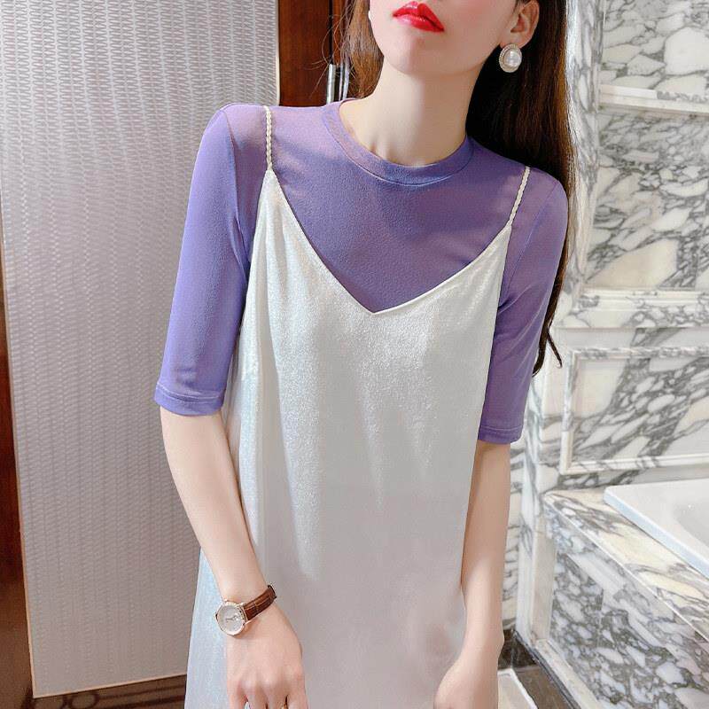 紧身蕾丝0310z t恤吊带裙内搭薄纱衣中袖 春夏网纱打底衫 女2026短袖