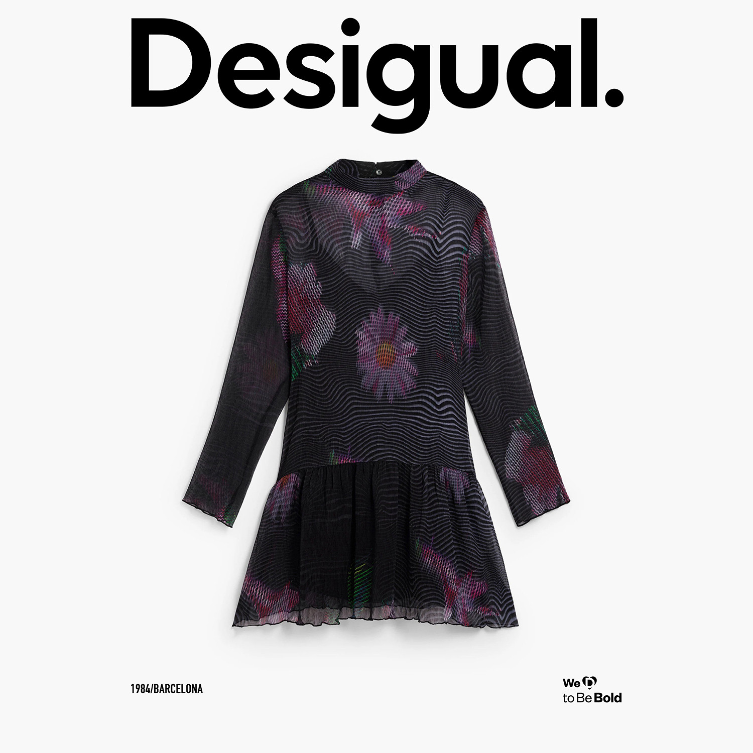 Desigual26春夏新品 连衣裙 轻薄波浪花卉印花半高领长袖