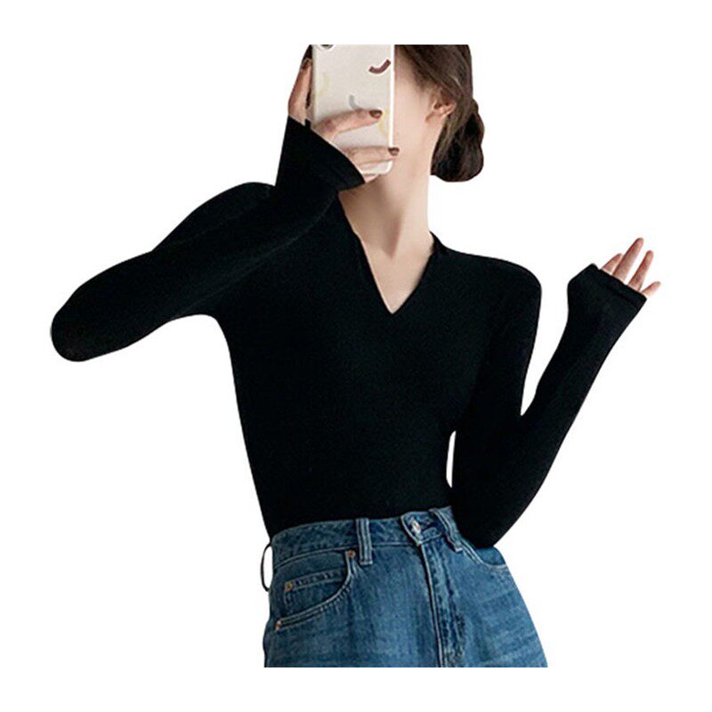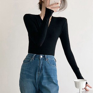 T恤黑色内搭 女春秋冬2025性感显瘦上衣长袖 高级感修身 深V领打底衫