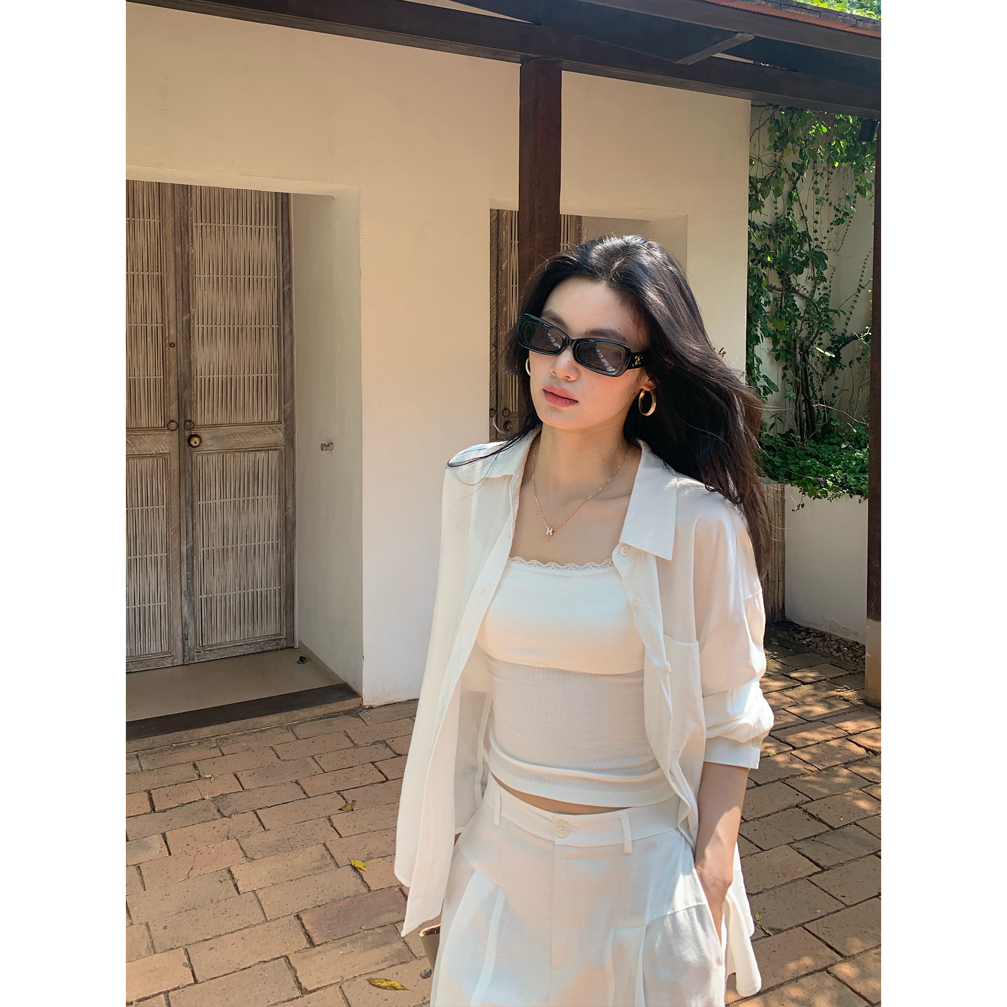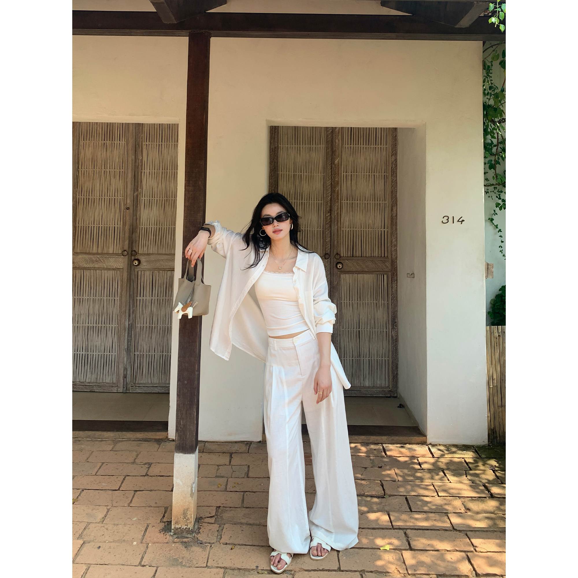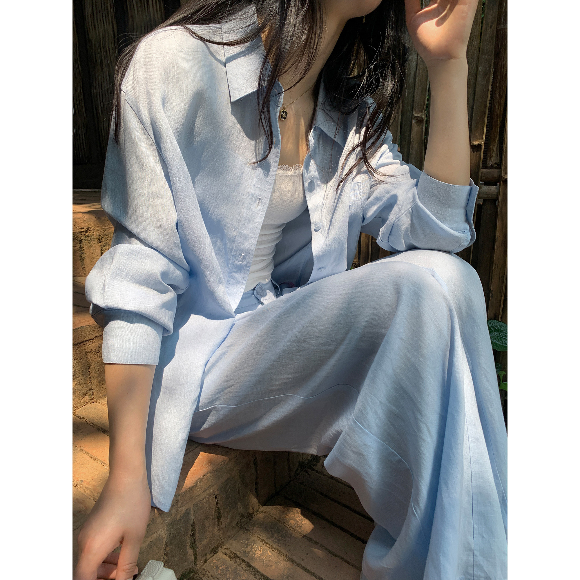 女宽松慵懒防晒衬衣休闲裤 pusumede 衬衫 莱赛尔亚麻长袖 轻氧套装