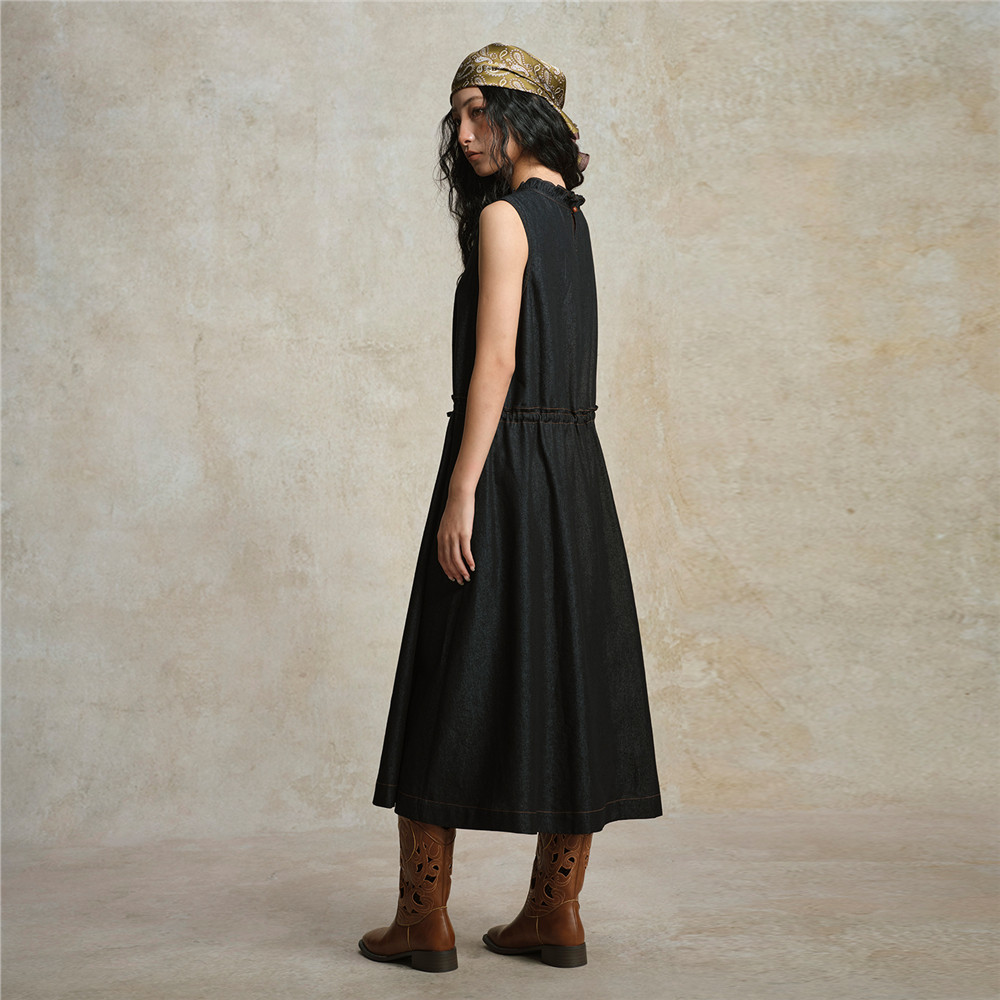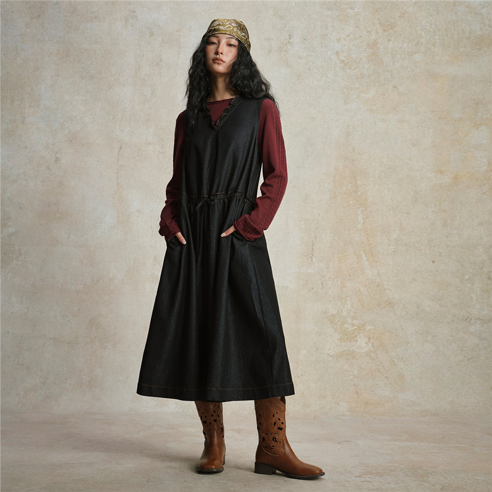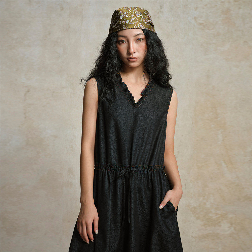设计师款 佐丹奴裙子女荷叶边V领抽绳收腰牛仔背心连衣裙18465224