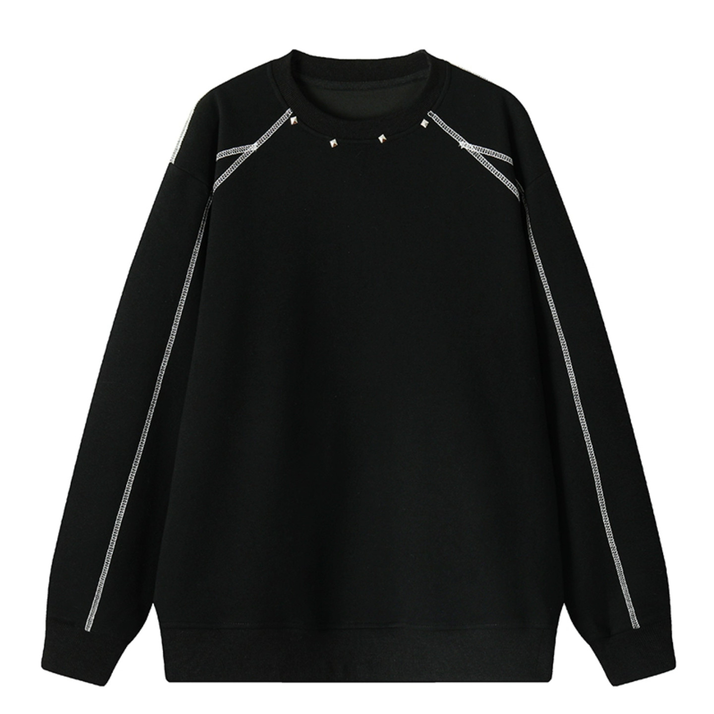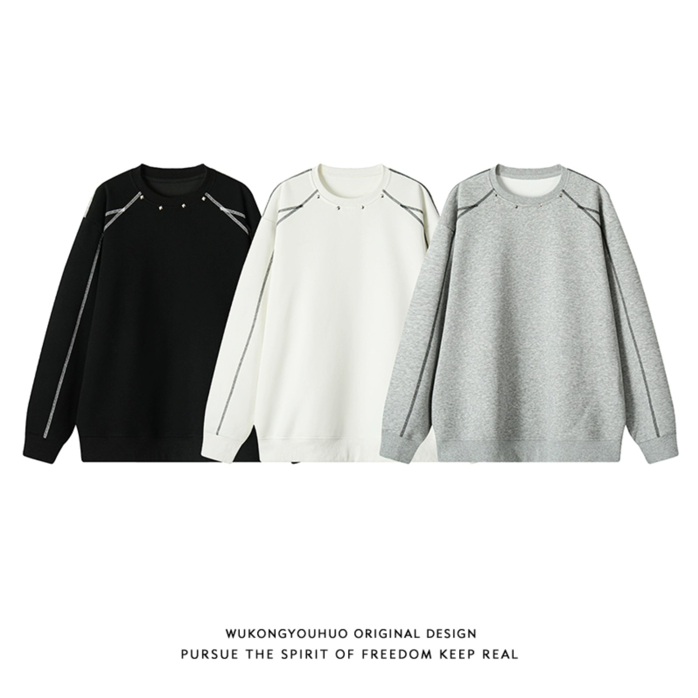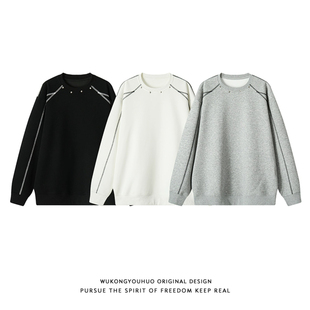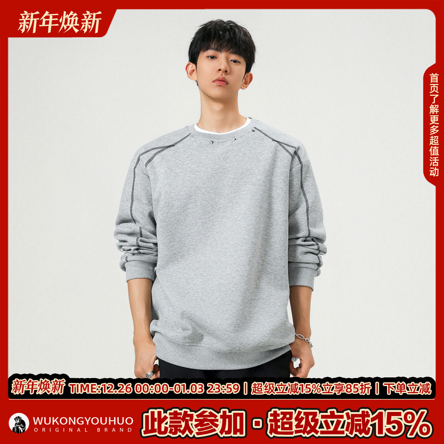 悟空有货复古辑明线铆钉圆领卫衣男秋季 潮牌宽松情侣百搭套头上衣