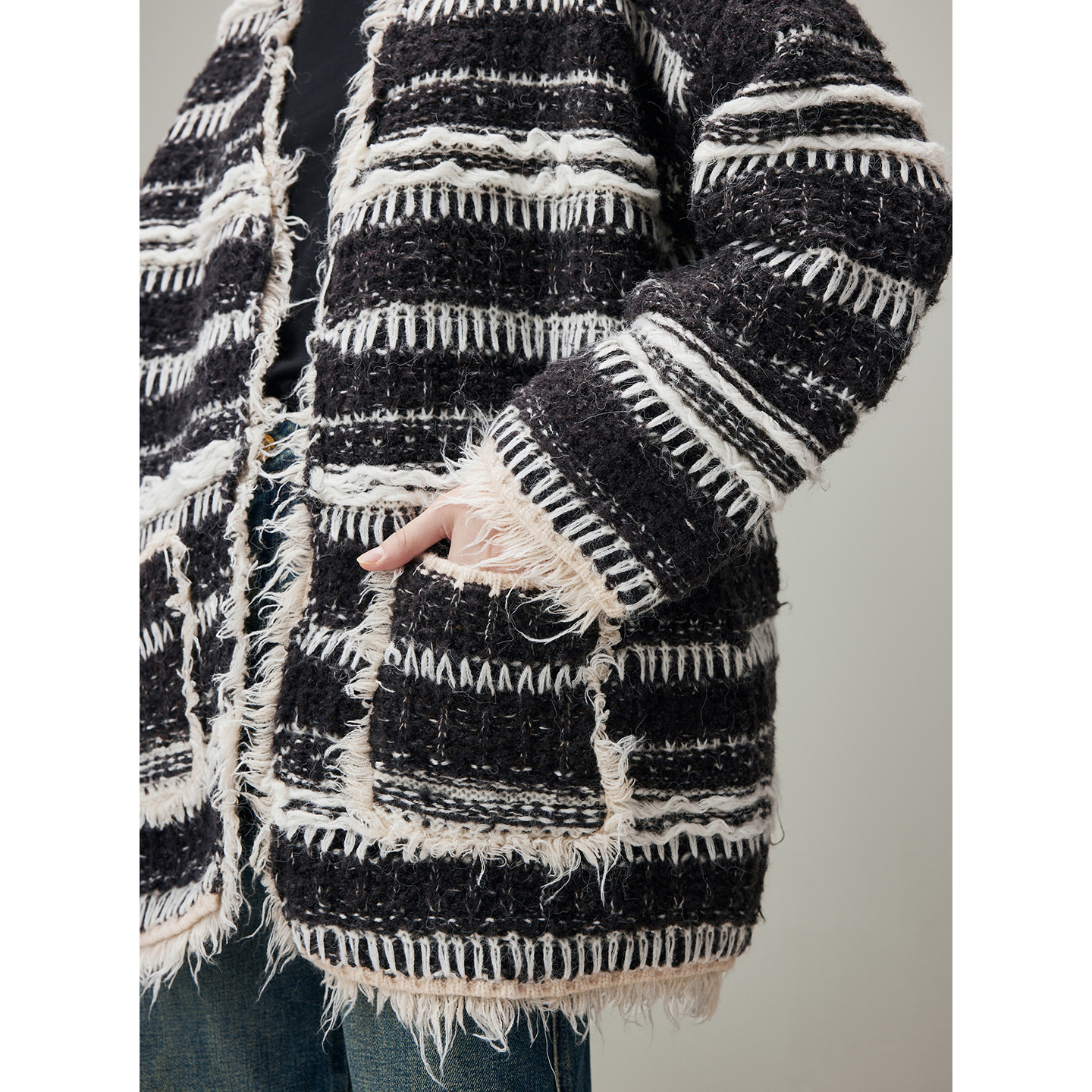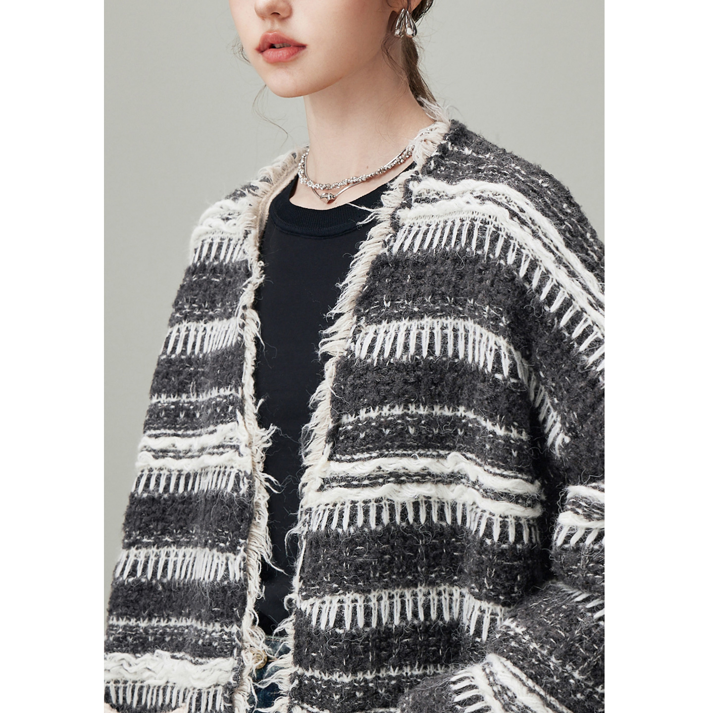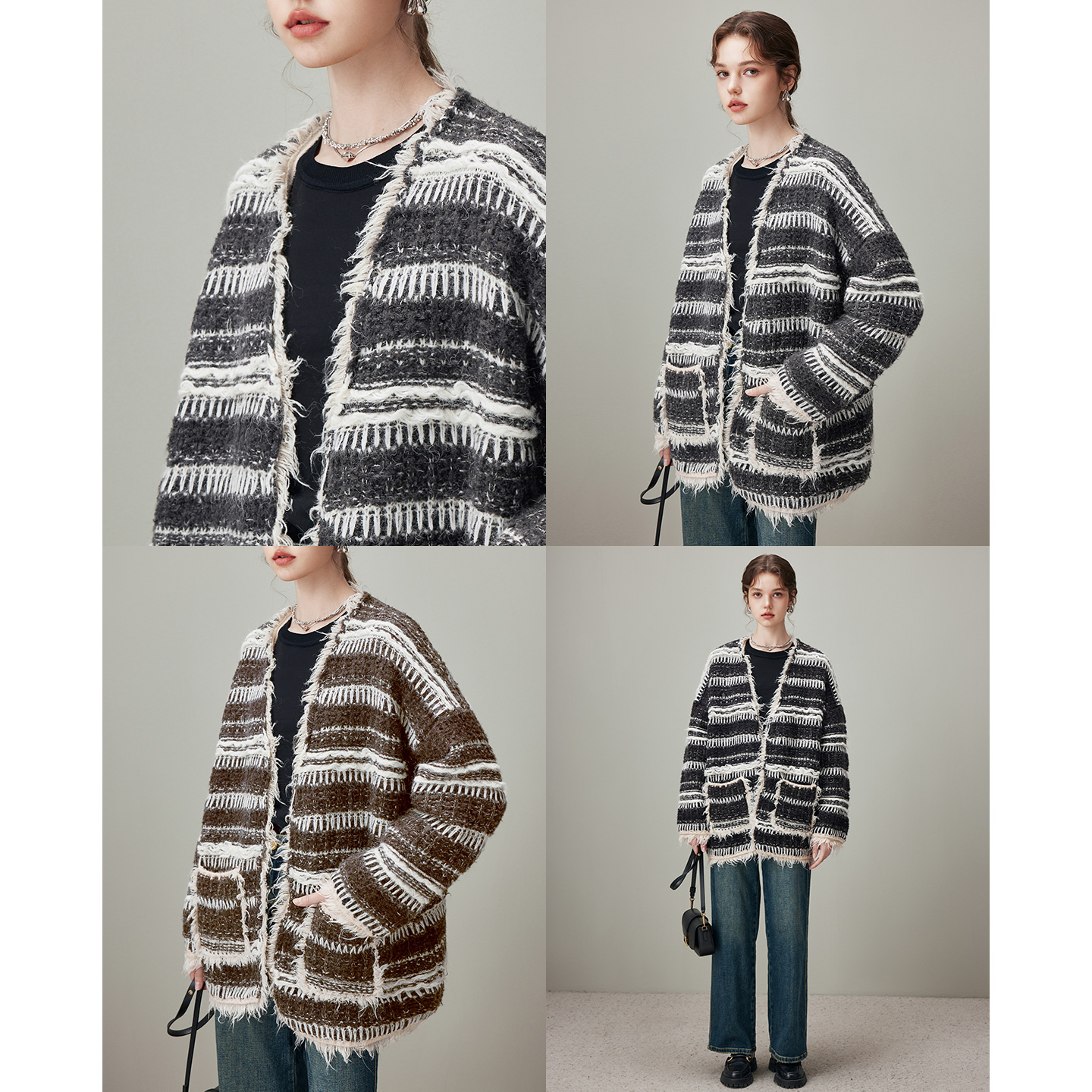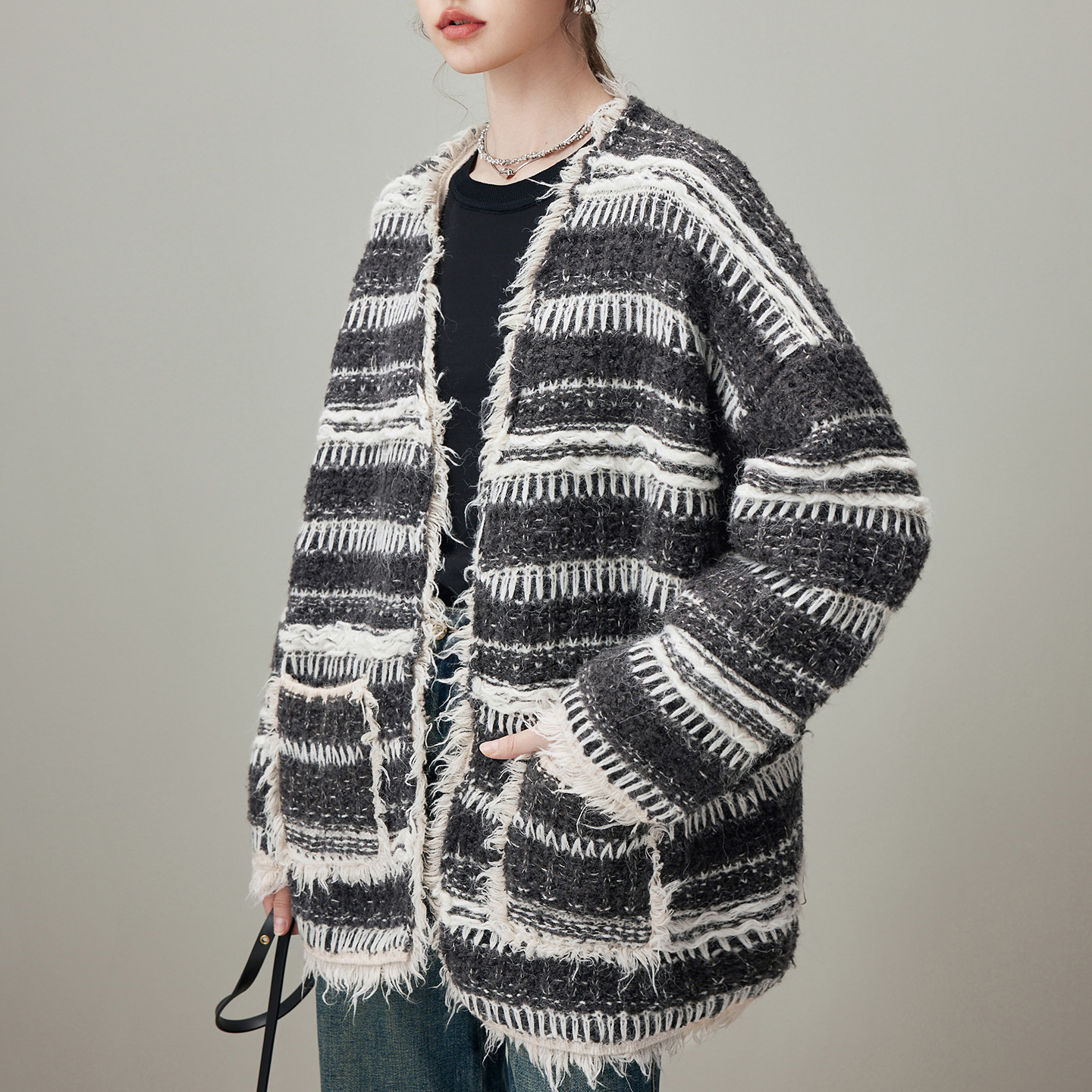 V领宽松开衫 新款 毛衣 条纹针织外套女2025年冬季 dfvc慵懒风中长款