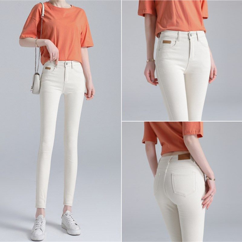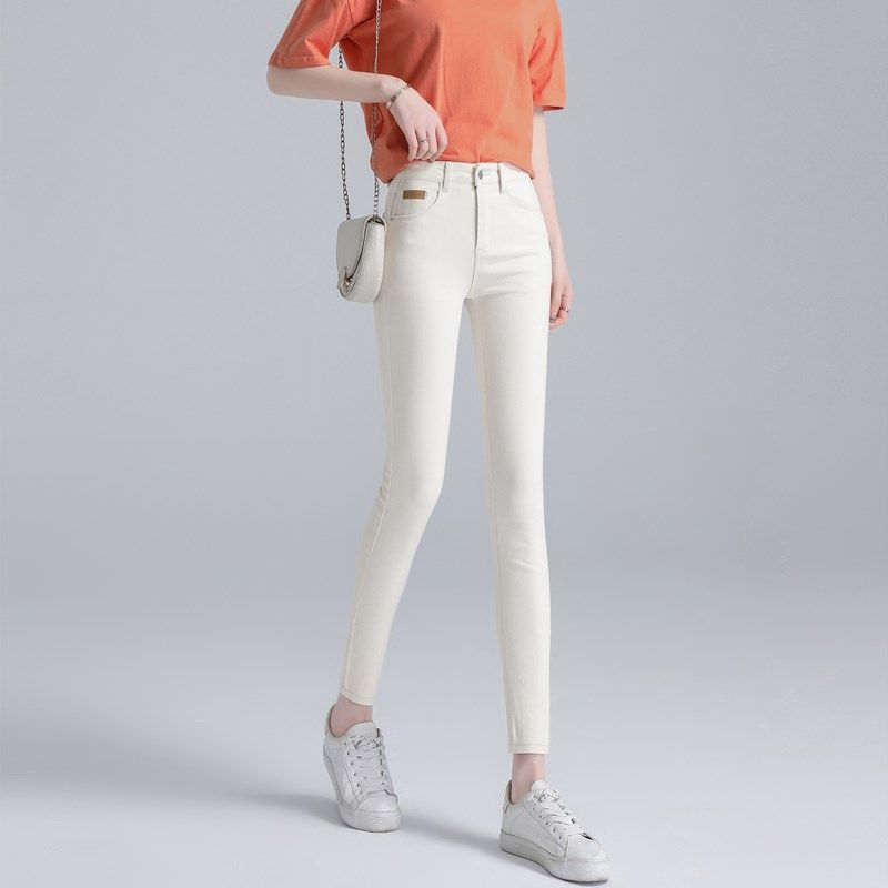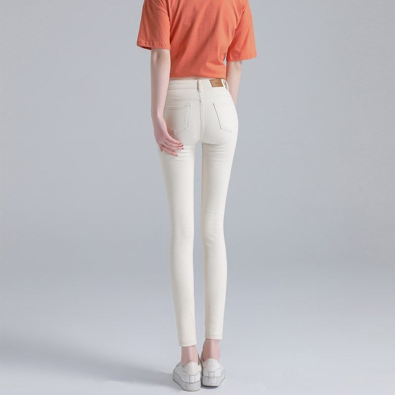 高个子加长紧身铅笔裤 显瘦2022年春秋新款 女小脚修身 米白色牛仔裤