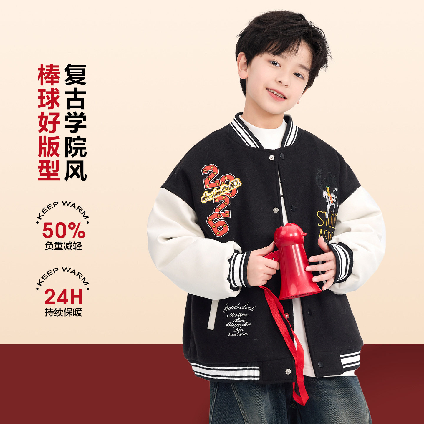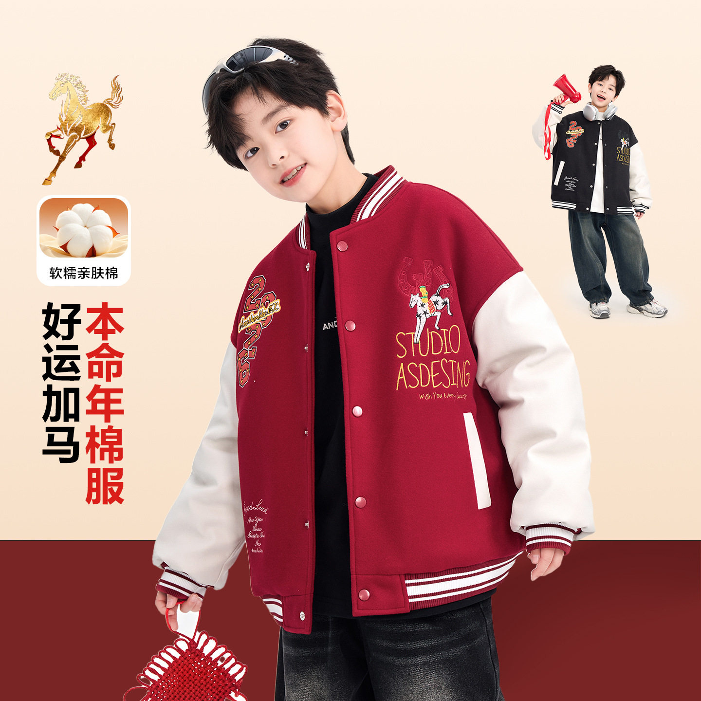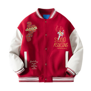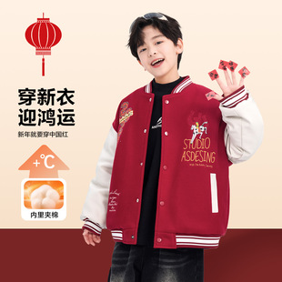 180 儿童拼接皮衣夹棉外套刺绣120 男孩红色棒球棉服新年装 26新款