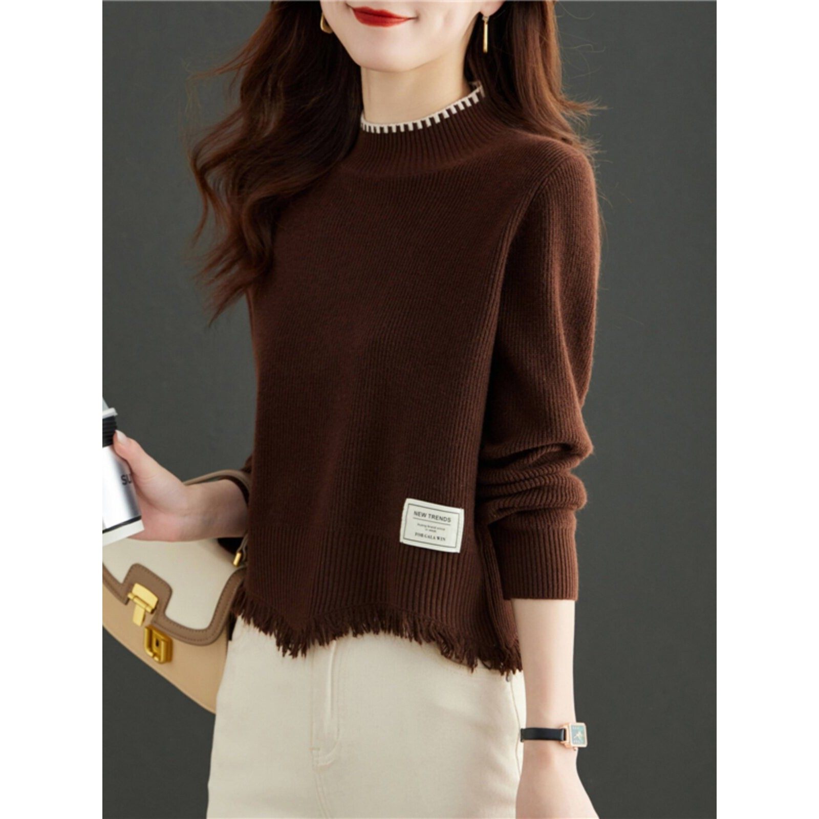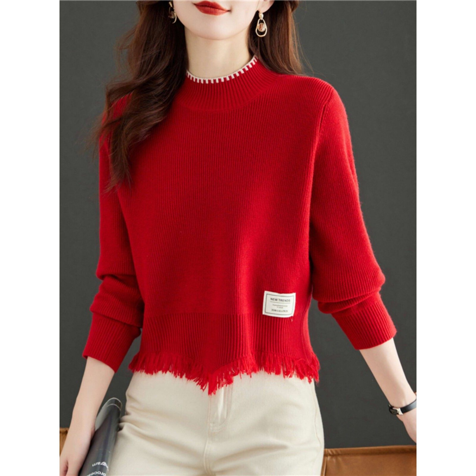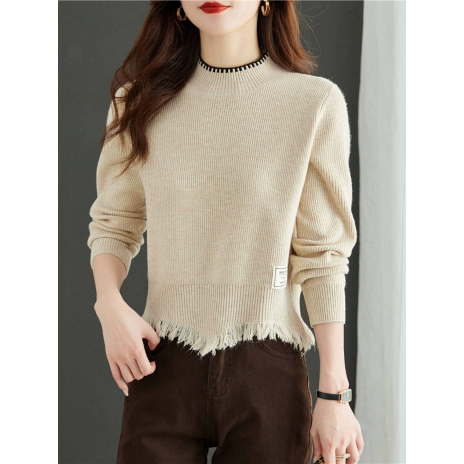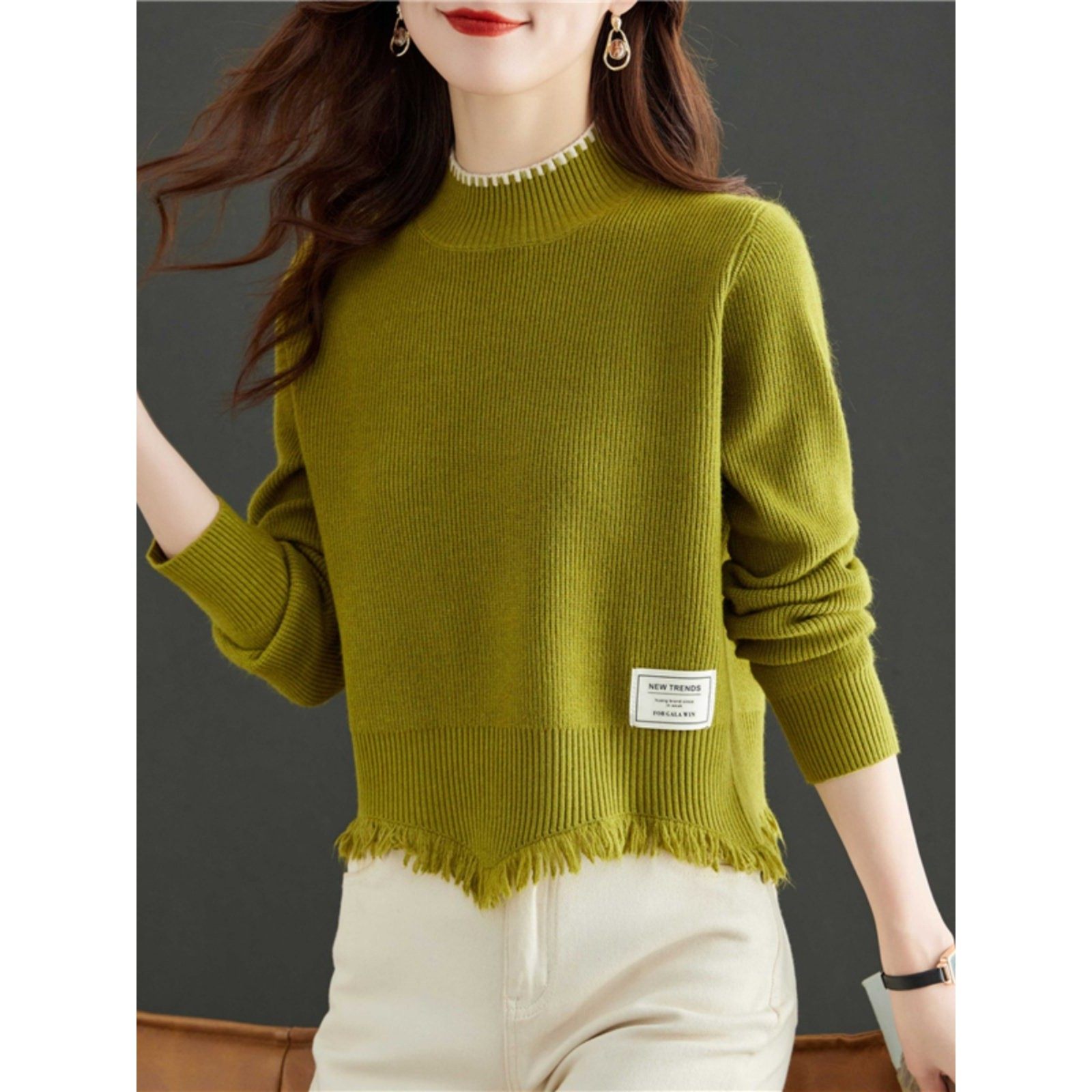 绿色流苏短毛衣 半高领高腰上衣配针织底 适合秋冬小个子妇女新款