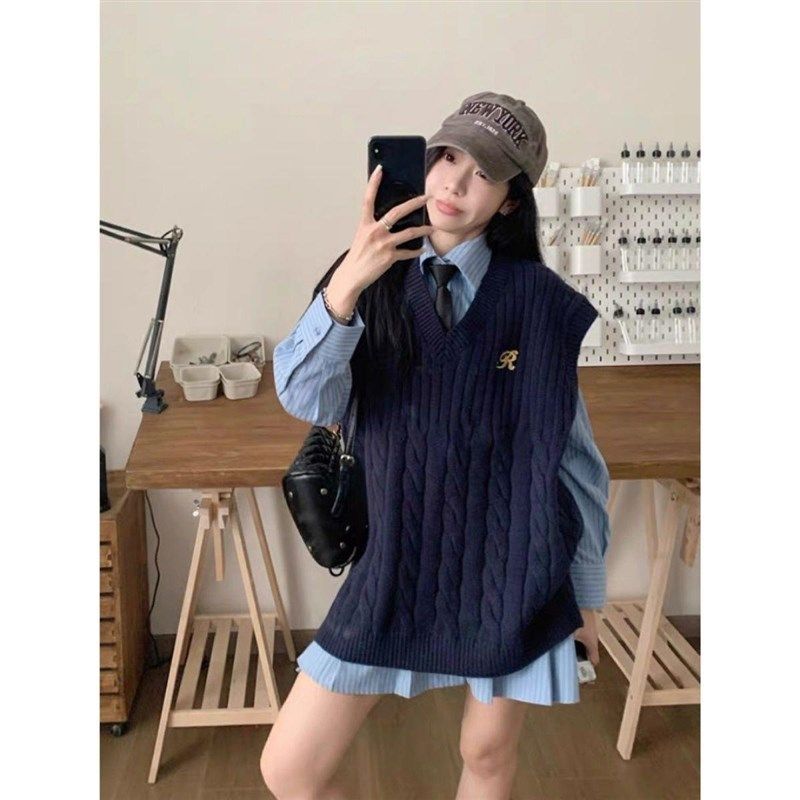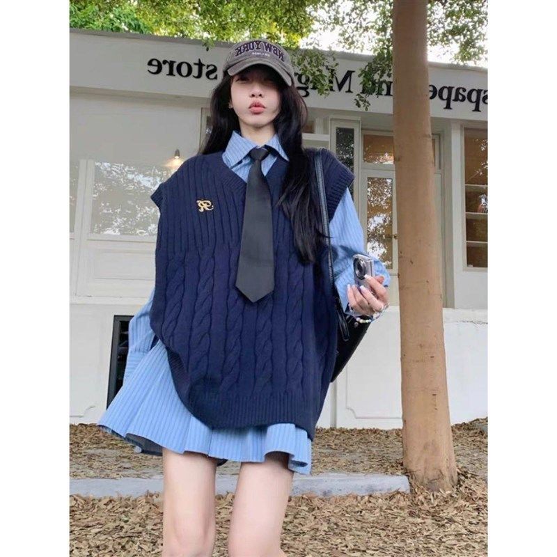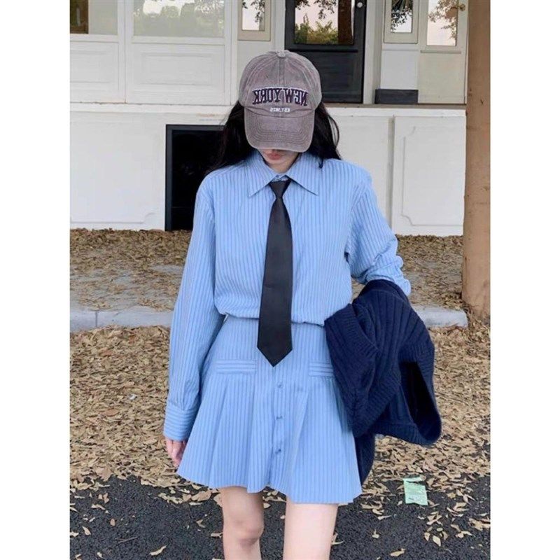 条纹衬衫 早秋季 长袖 女针织马甲背心 裙两件套裙子 学院风叠穿套装