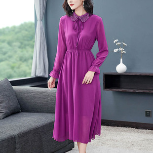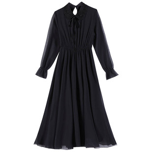 收腰显瘦气质打底裙 春秋娃娃领长款 雪纺波点连衣裙女长袖 2020新款