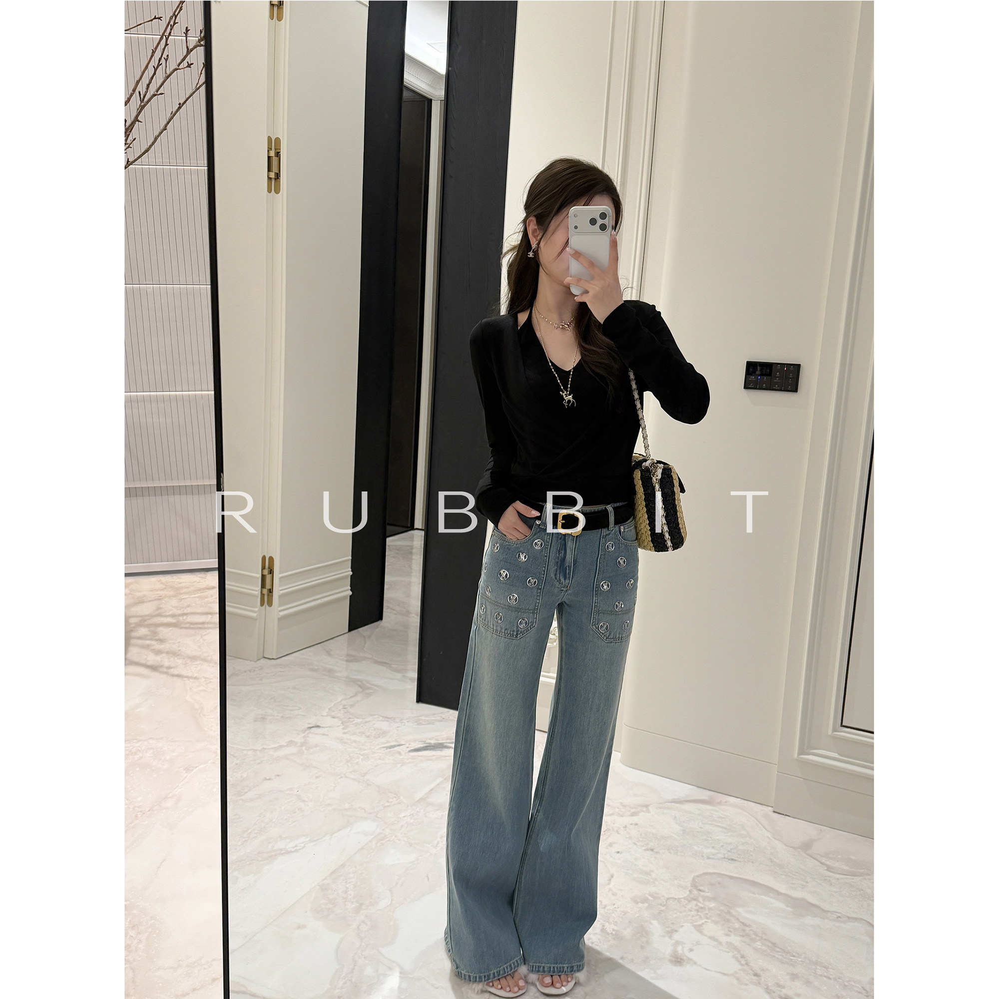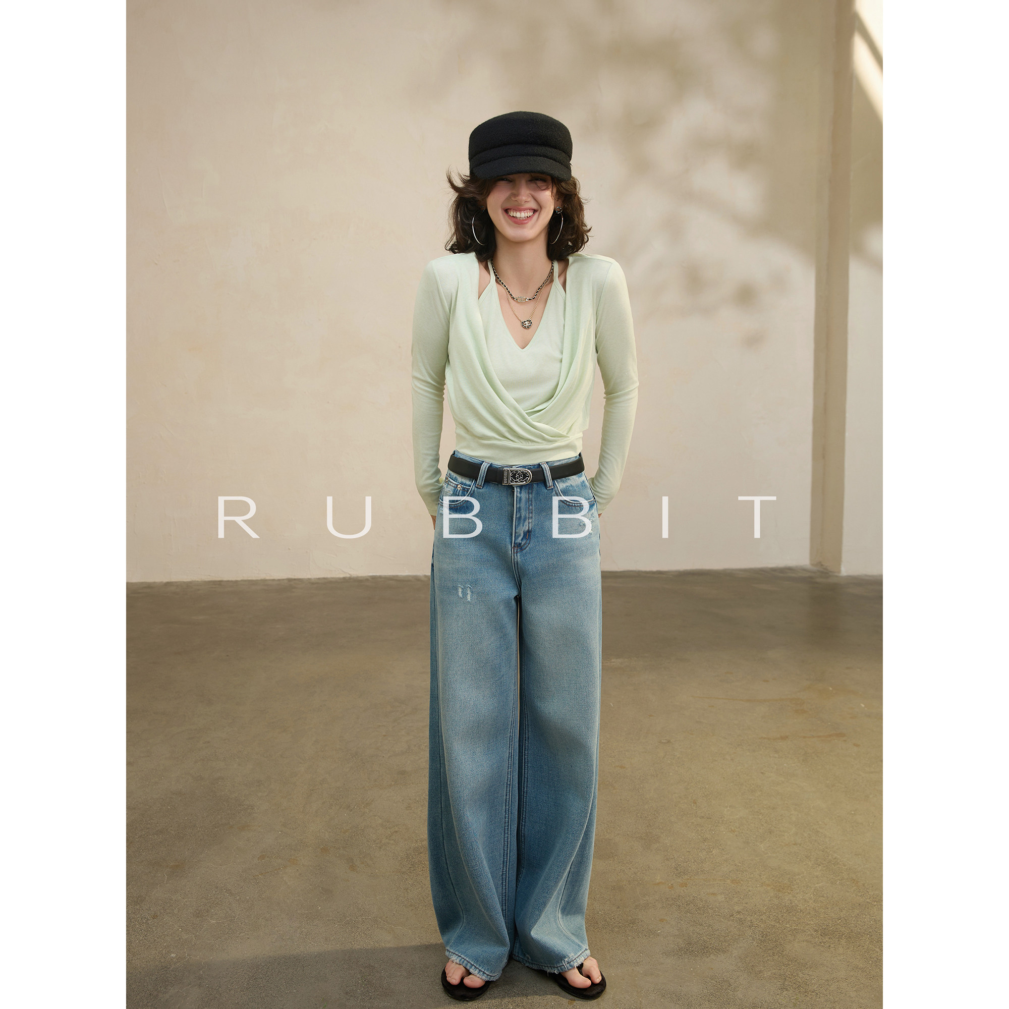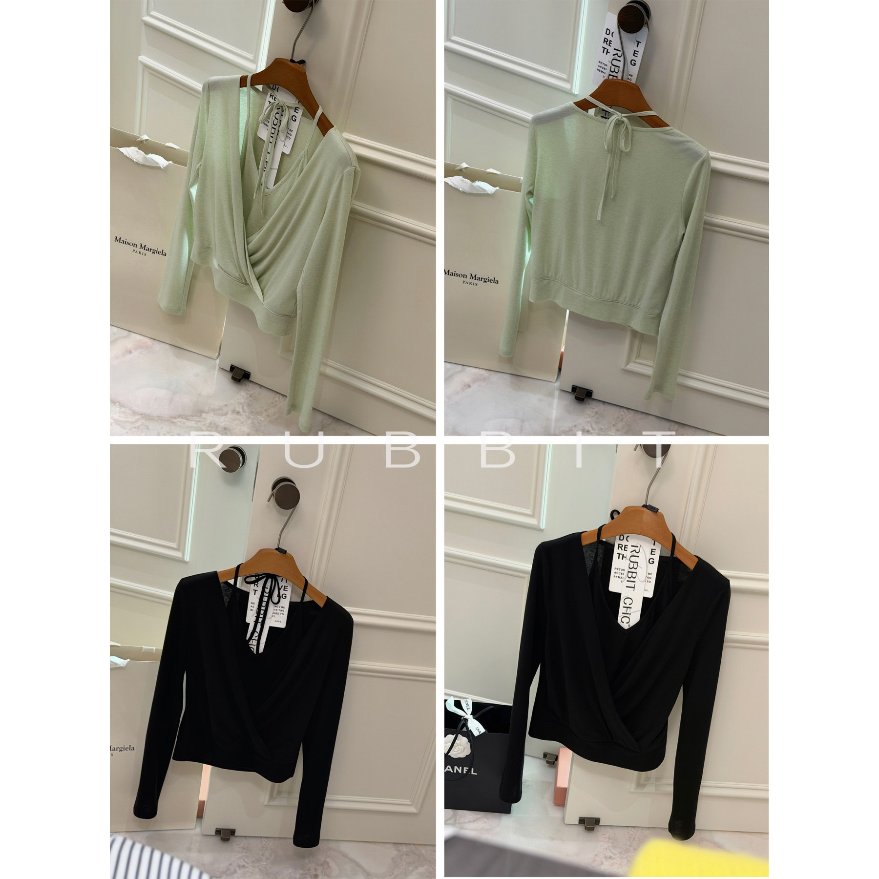 气质叠穿假两件挂脖V领设计长袖 简奢智性美 一眼爱 RUBBIIT原创