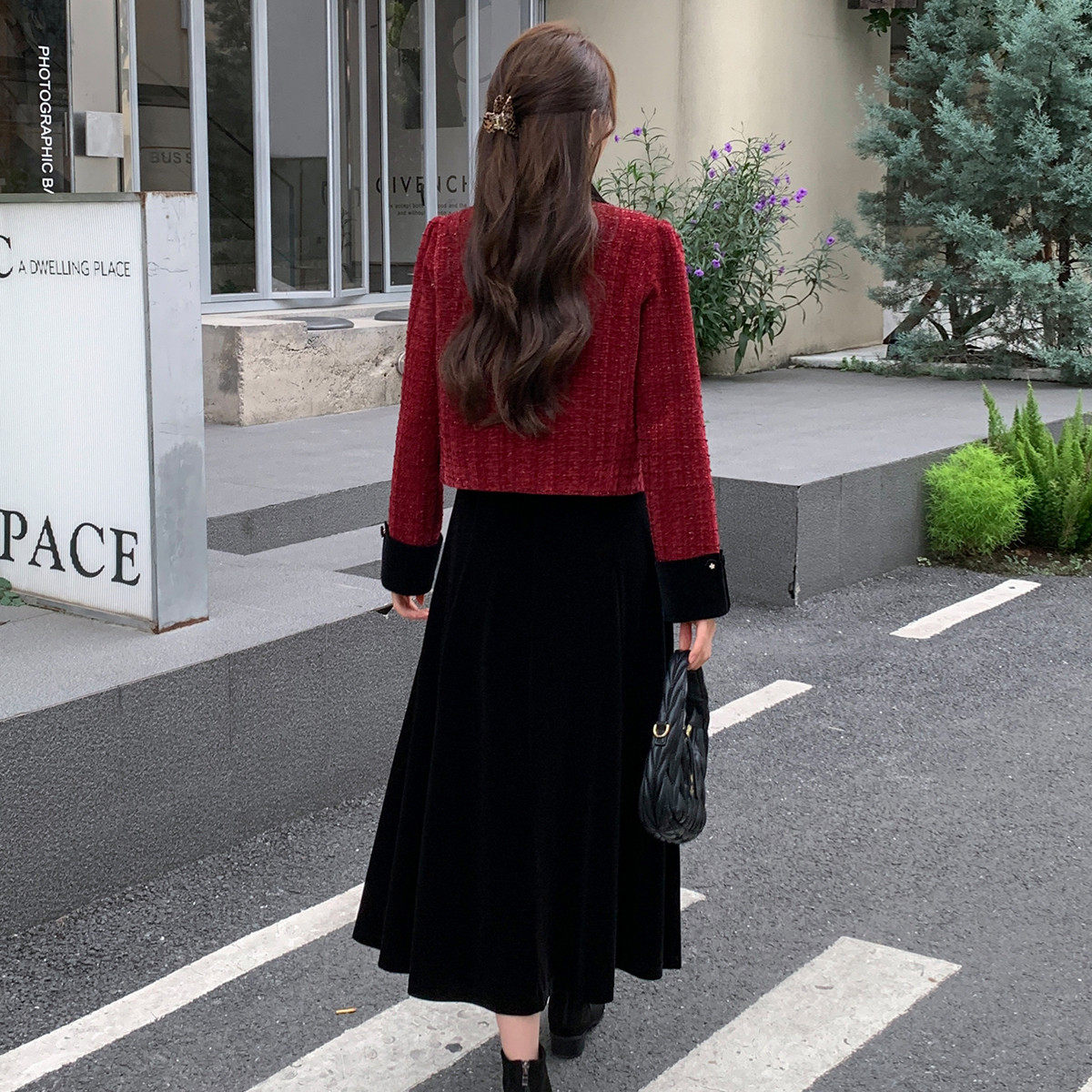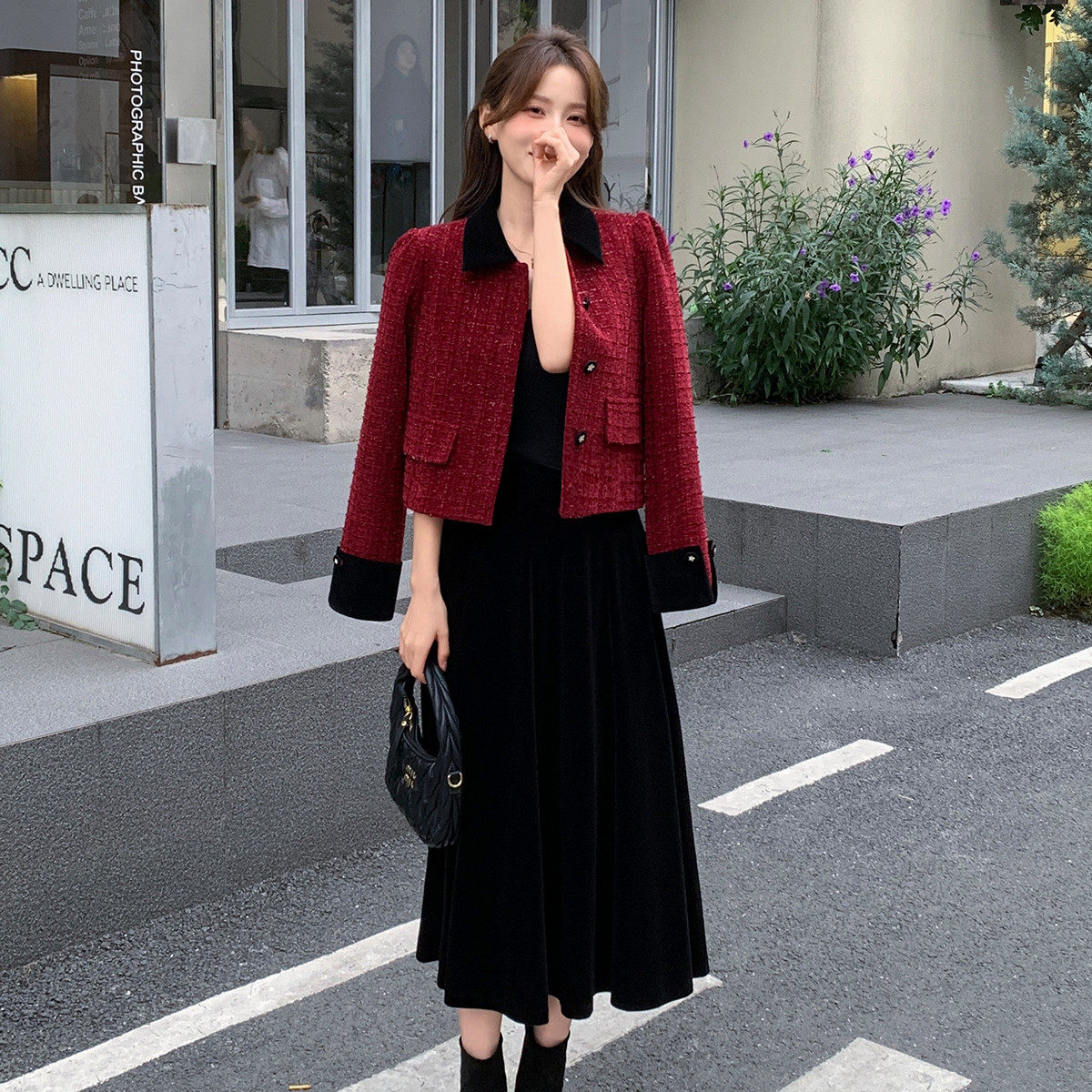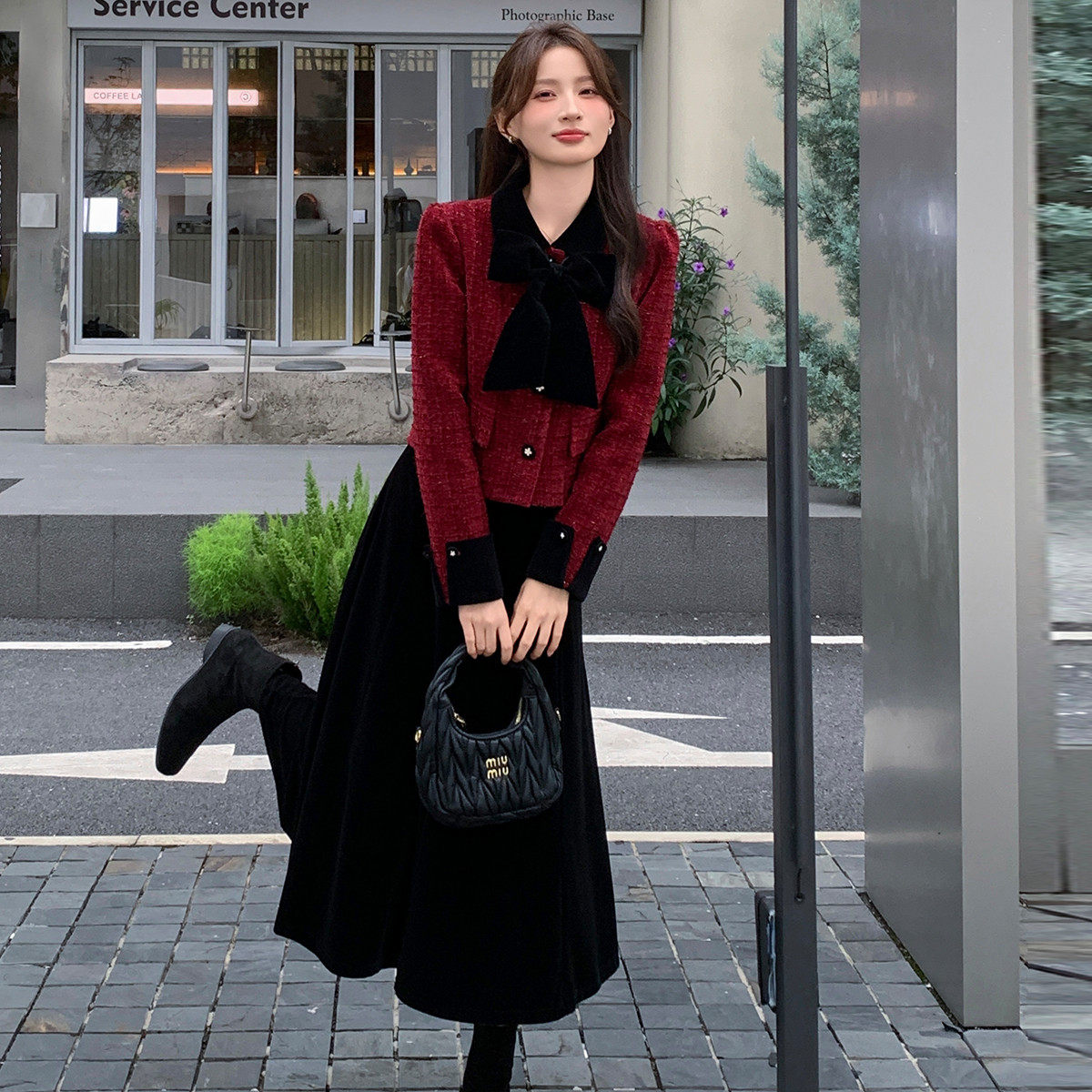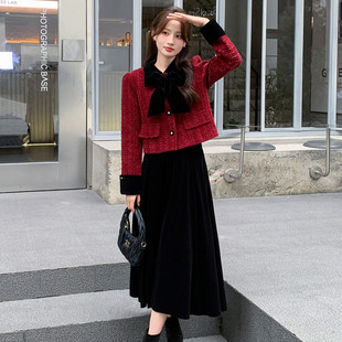 2025秋季 小香风外套搭蝴蝶结领带 新款 翻边袖 半身裙 套裙