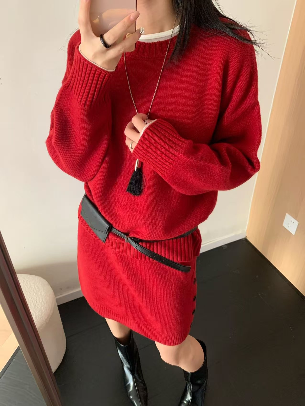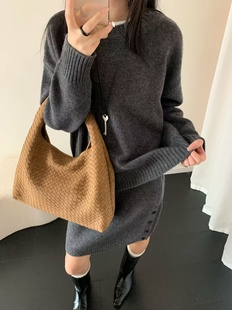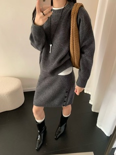 女软糯洋气慵懒风套裙58278 配短裙套装 26早春新款 羊毛圆领针织衫