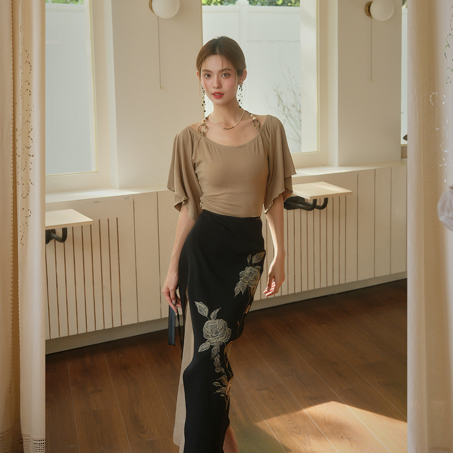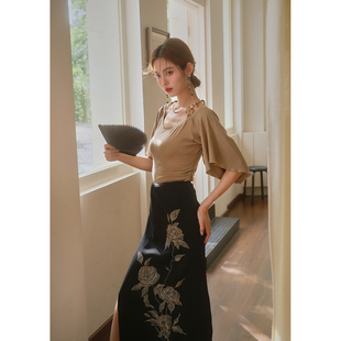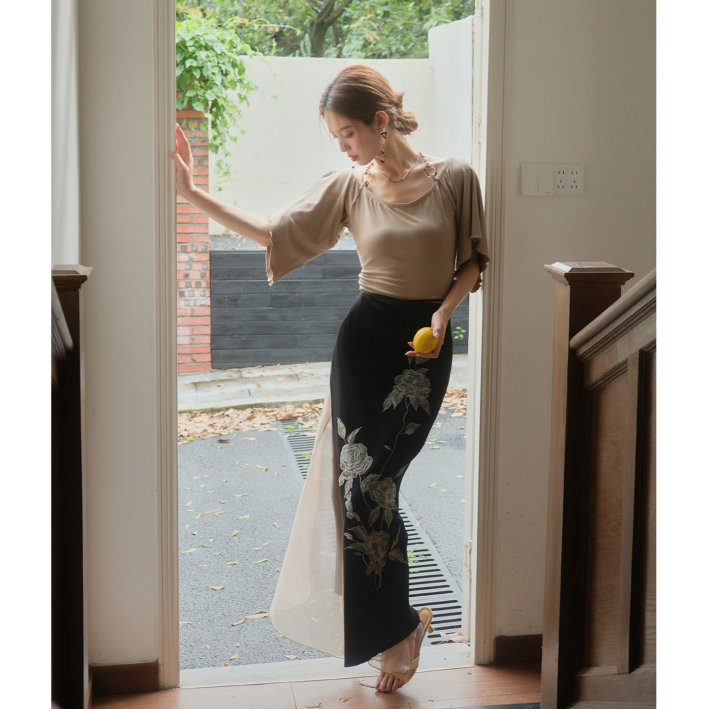上衣重工珠片绣一片半裙 串珠系带抽褶喇叭袖 彼得潘大叔 如荼