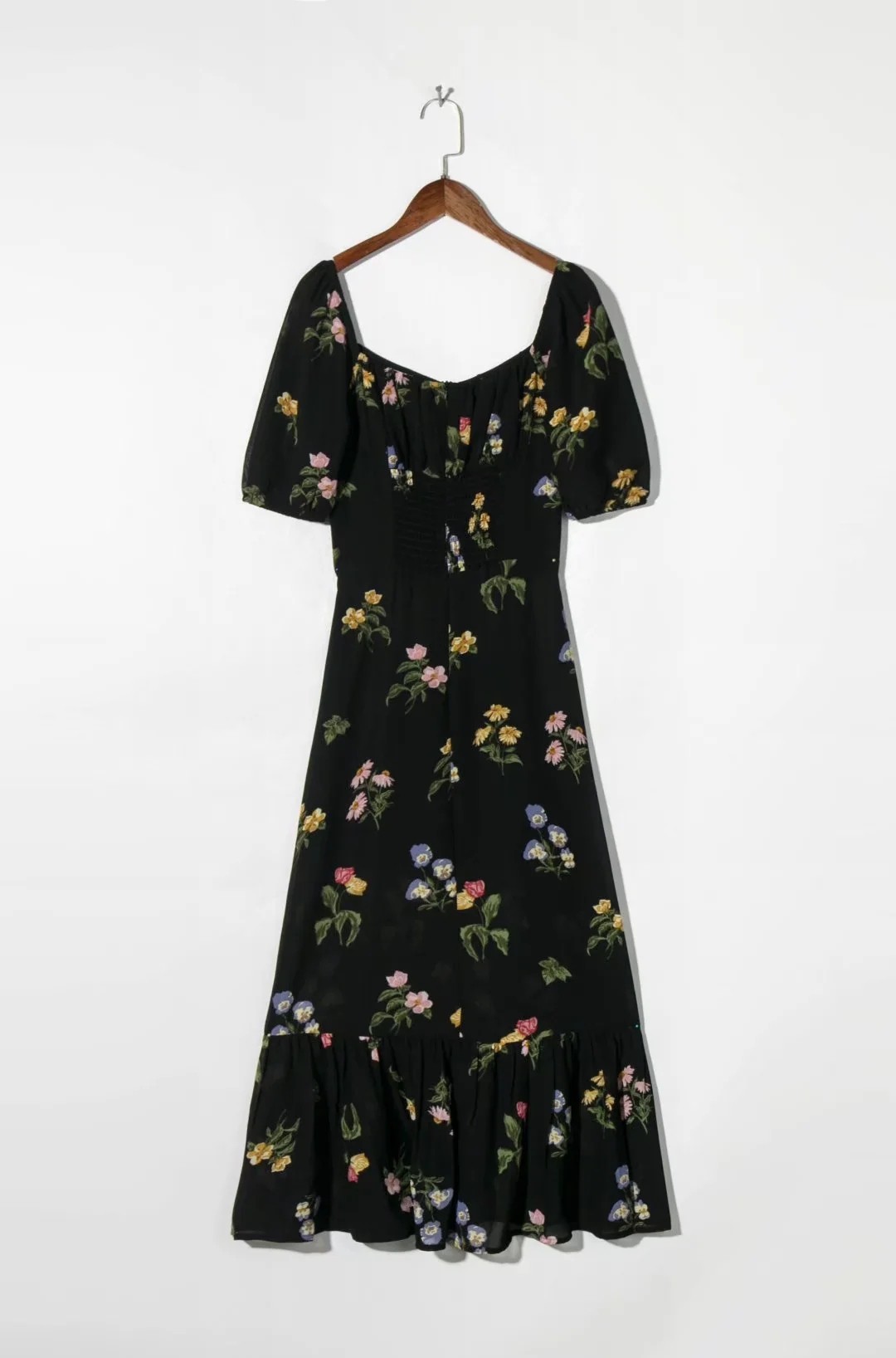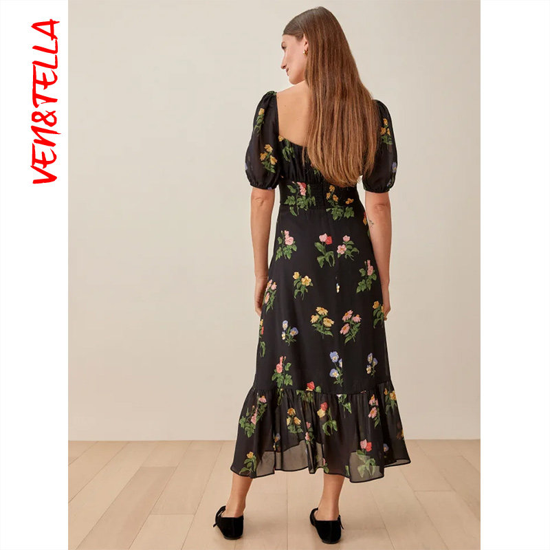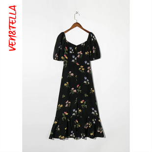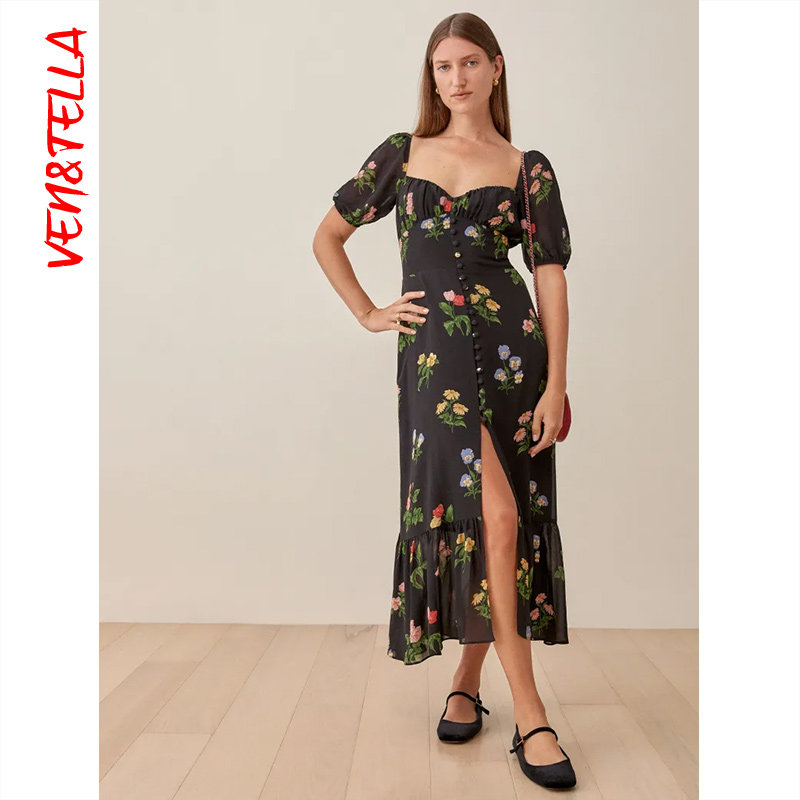 方领泡泡袖 法式 褶皱开叉气质收腰排扣连衣裙 欧美风 VEN&TELLA夏季