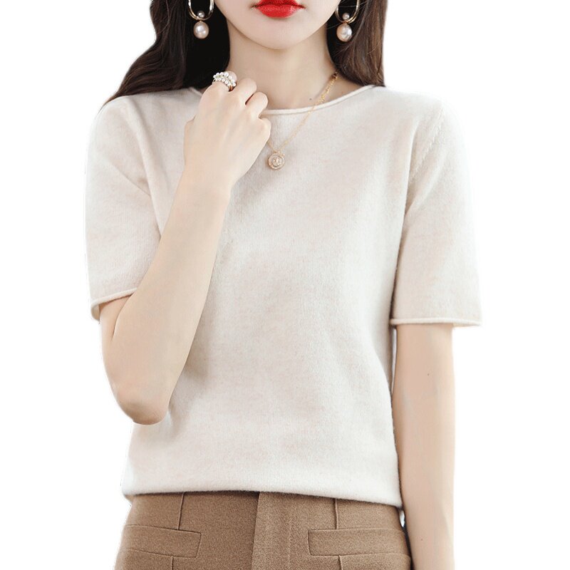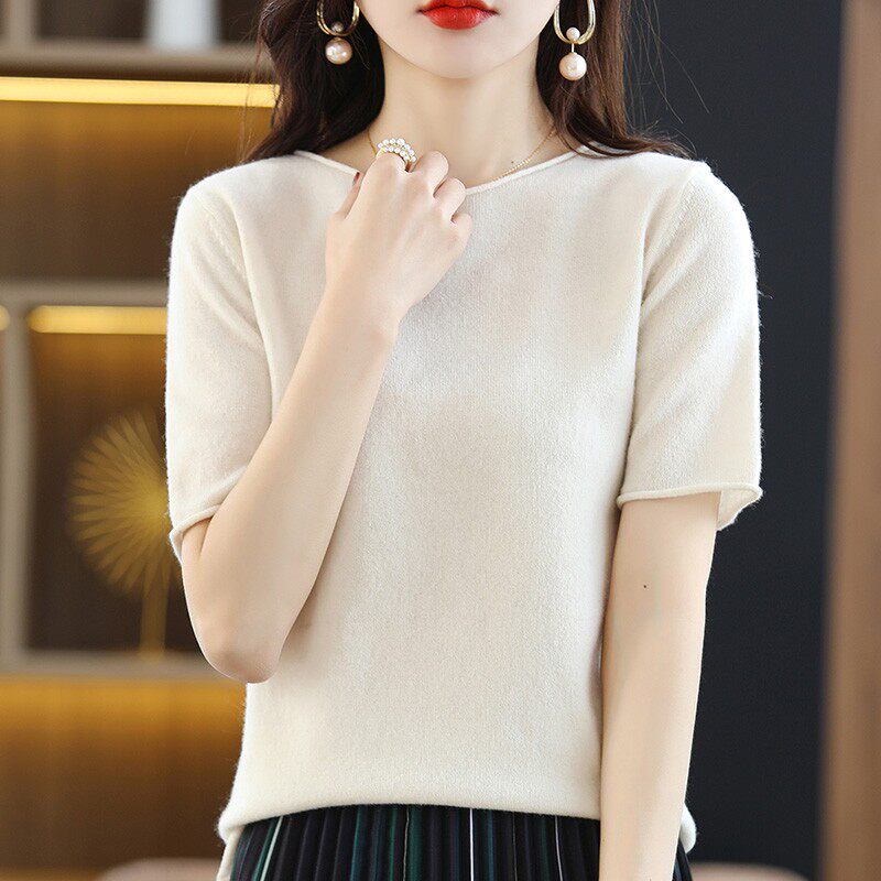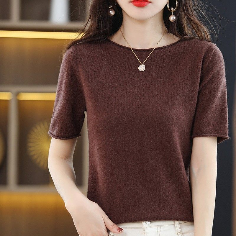 针织T恤衫 上衣薄款 女套头半袖 气质百搭短款 毛衣春秋新款 圆领短袖