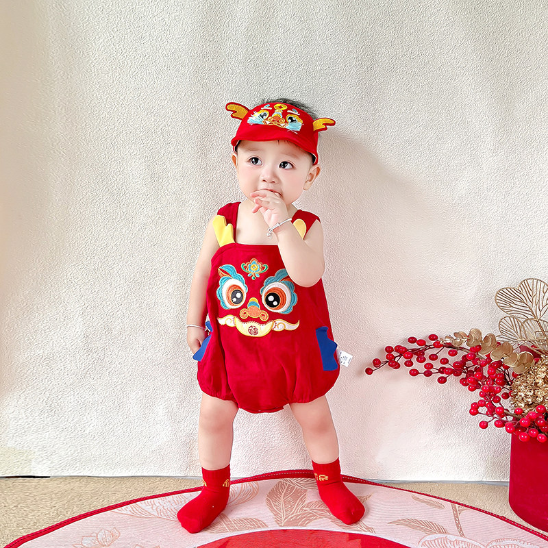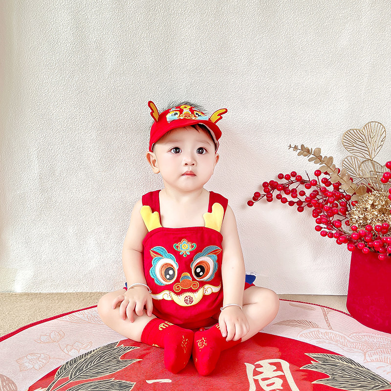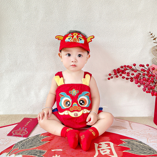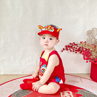 薄款 周岁礼服男宝宝女童红色中式 抓周婴儿百天衣服三角包屁衣夏装
