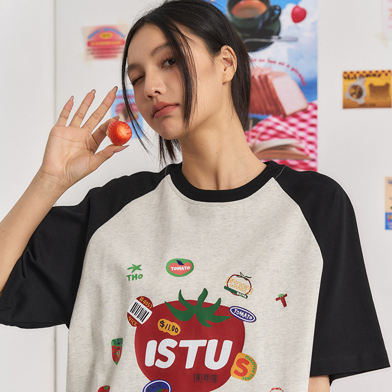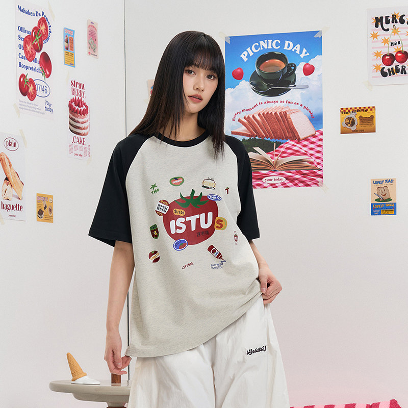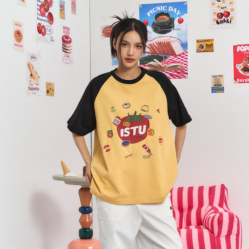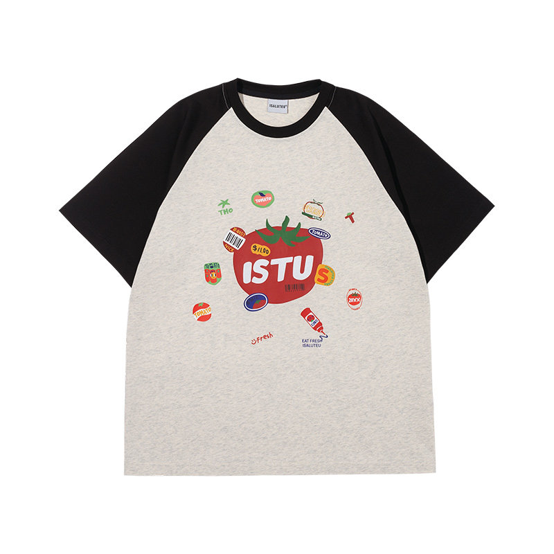 宽松小众半袖 iSaluteU t恤夏季 复古小番茄撞色插肩短袖 上衣 美式