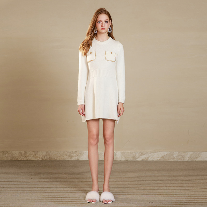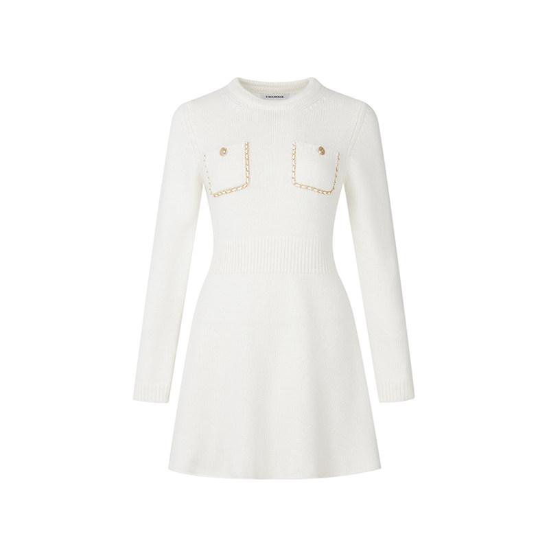 EIMISMOSOL黑白色毛针织收腰链条高级撞色秋冬新款 休闲连衣裙