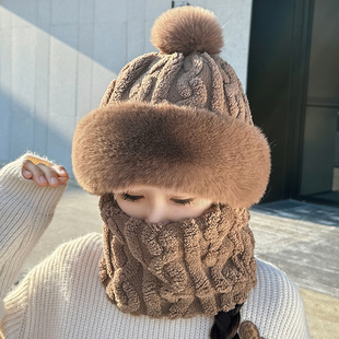 秋冬大头围毛绒绒显脸小帽子女可爱绑带保暖防寒针织帽套头毛线帽