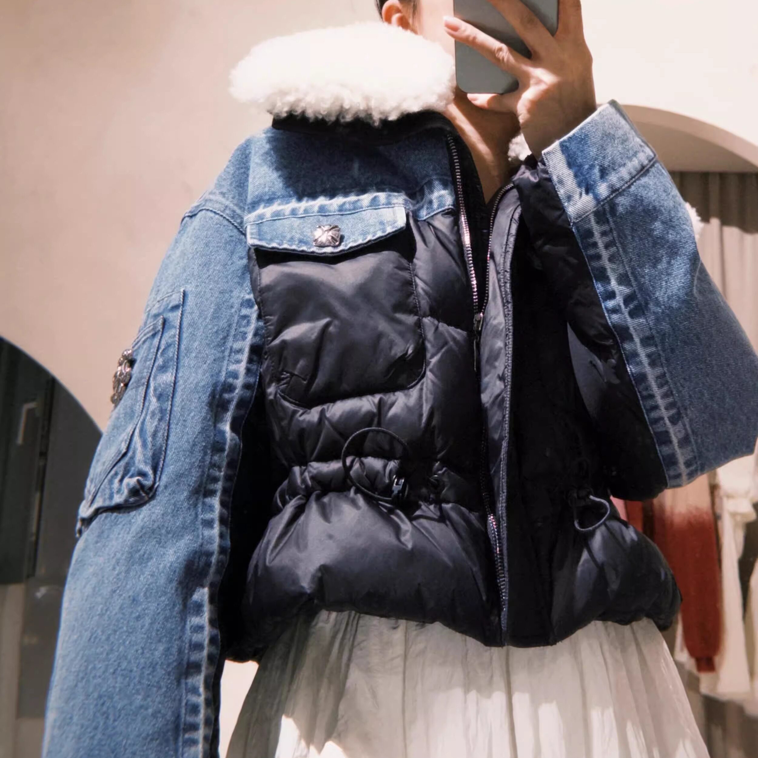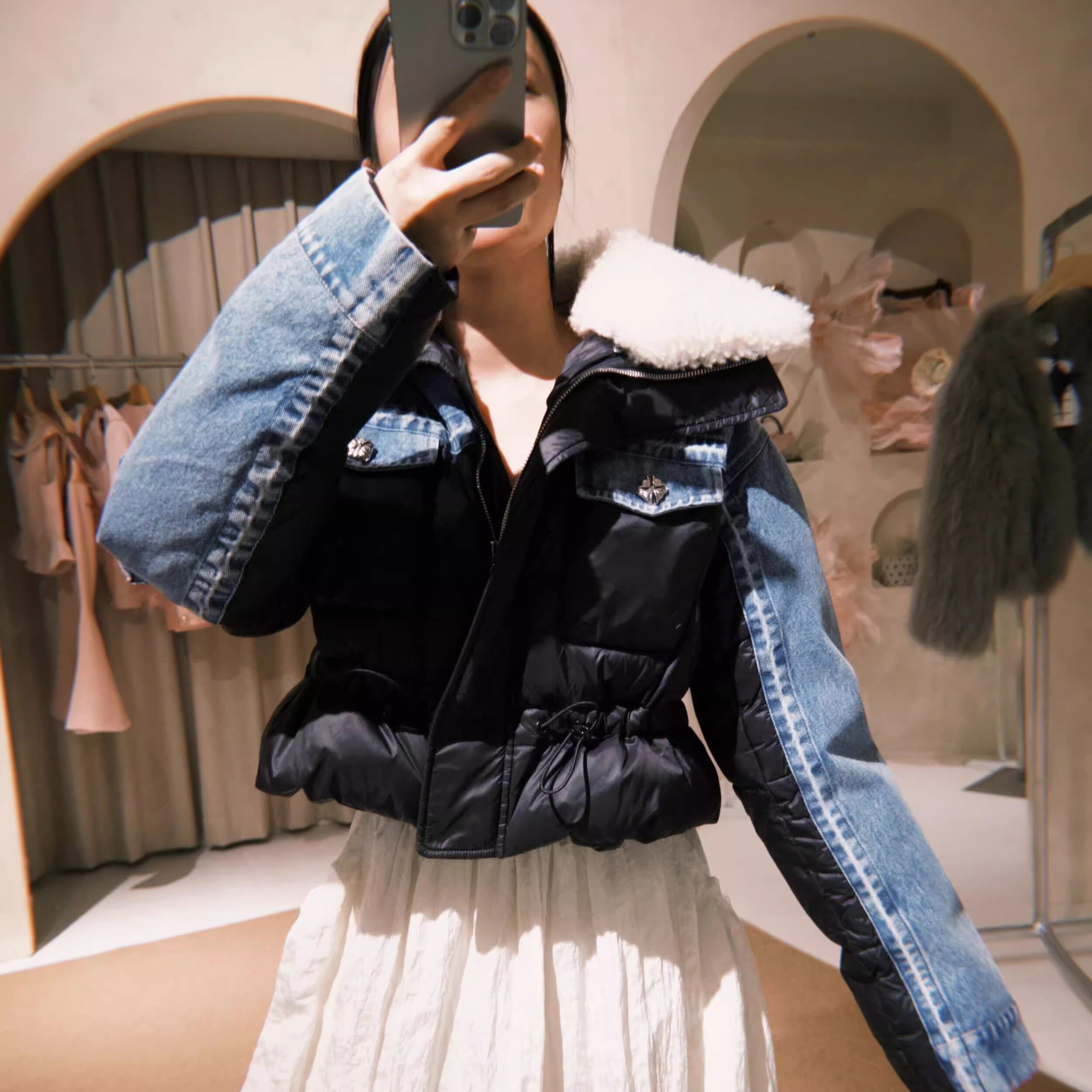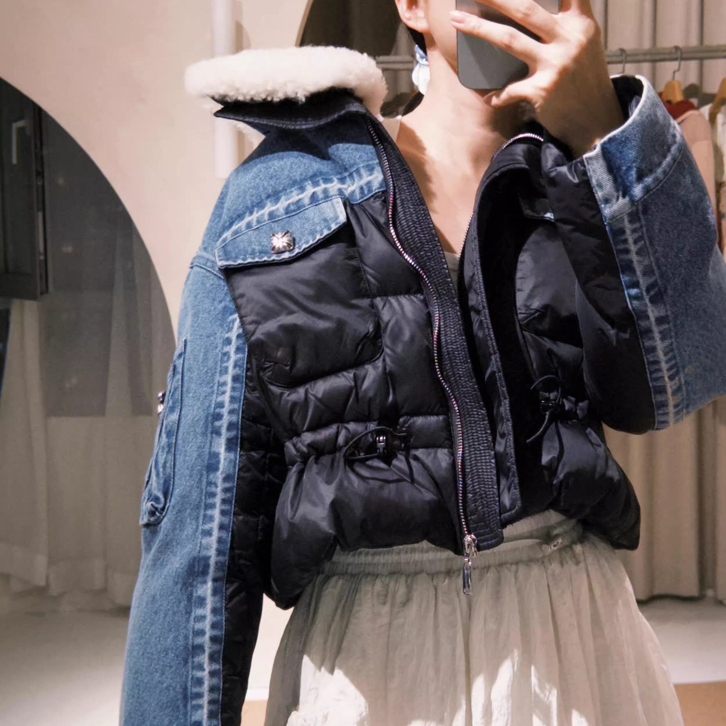 4折 牛仔拼接抽绳羊羔毛领羽绒服 4MILE设计师品牌