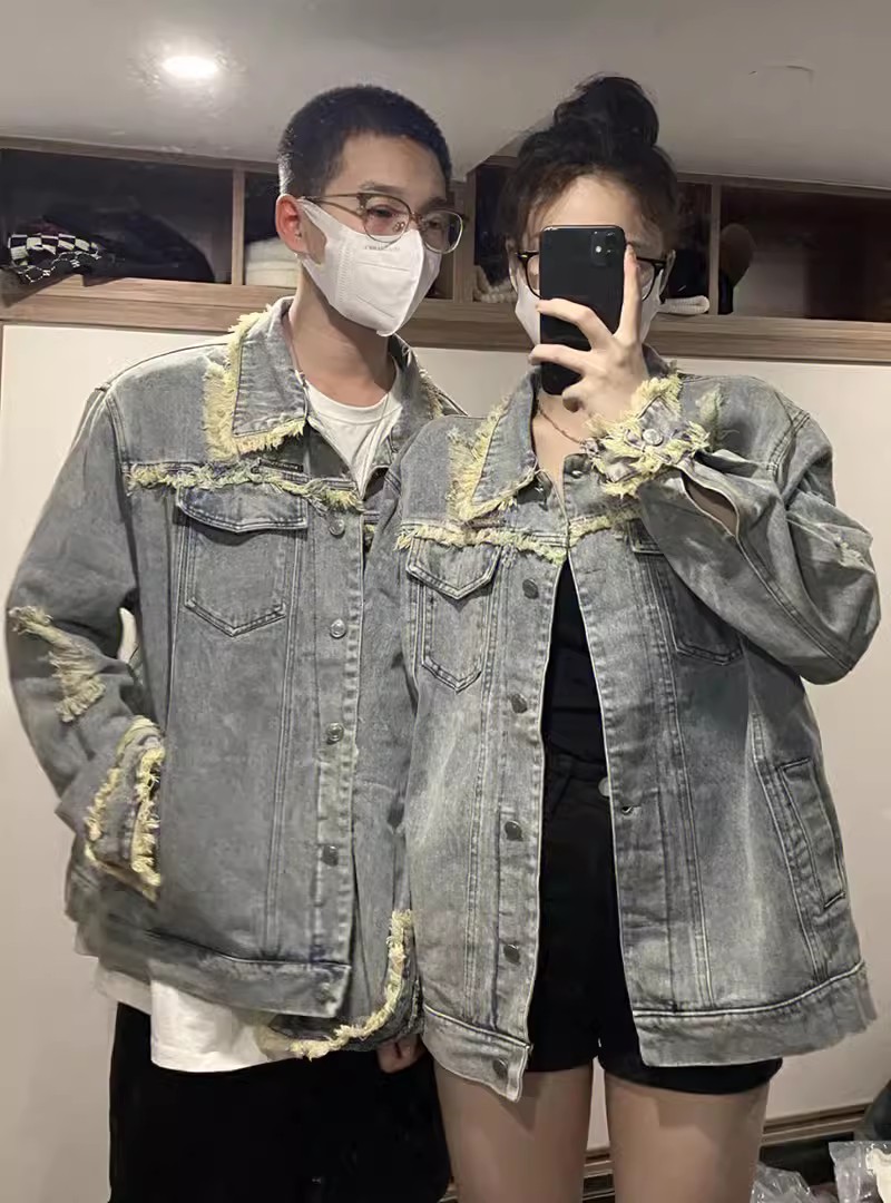 夹克上衣潮 胖MM宽松慵懒风情侣装 破洞毛边牛仔外套女春秋新款 大码