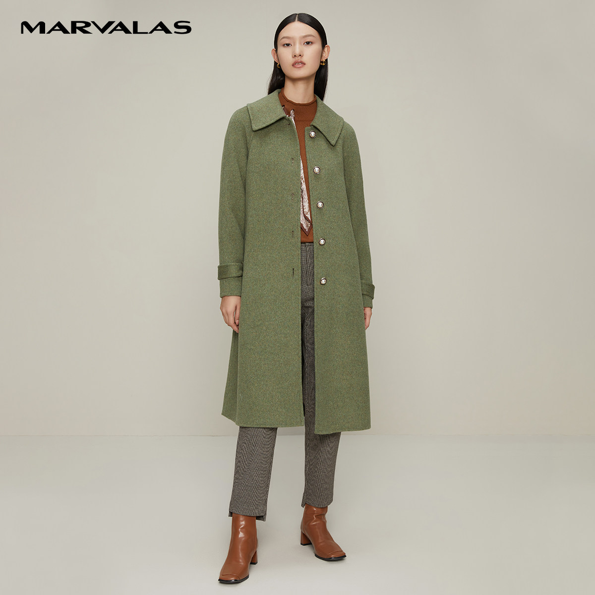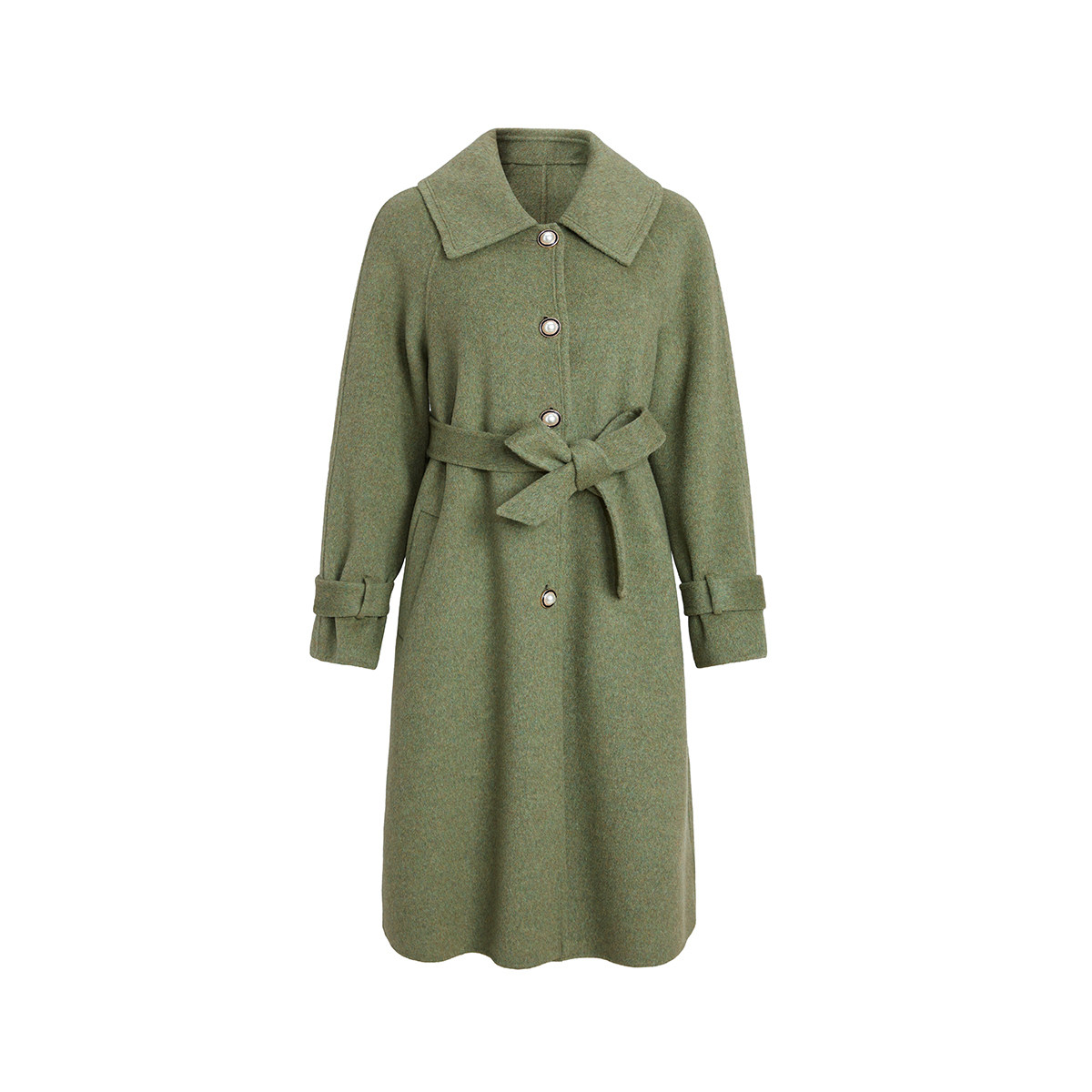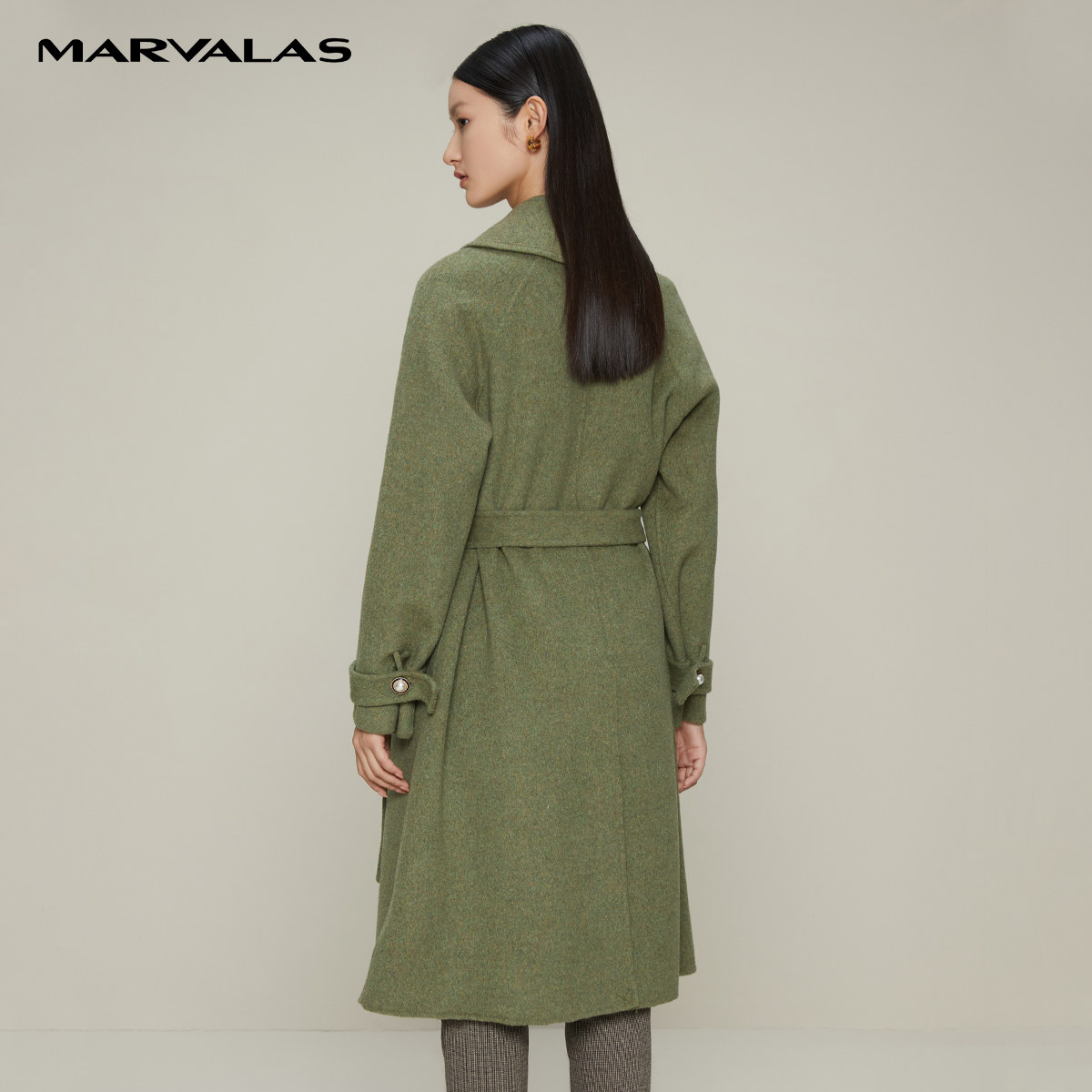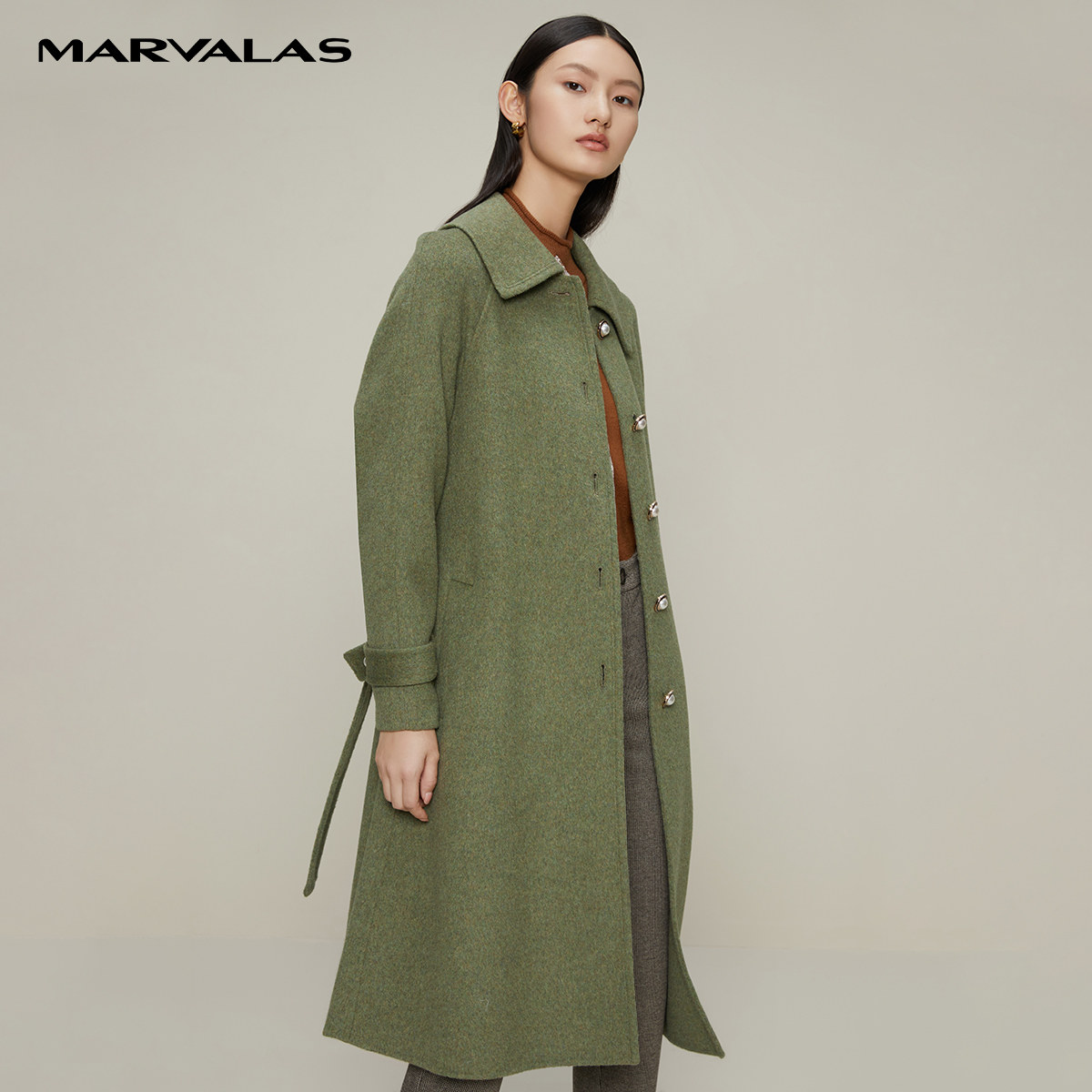 外套 羊毛混纺简约中长款 曼德诗绿色单排扣双面呢大衣2024冬季 新品