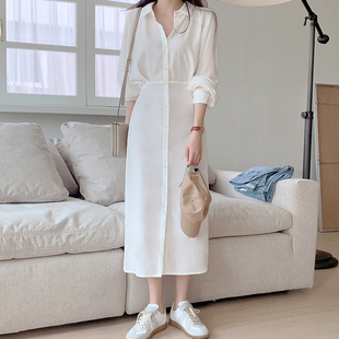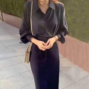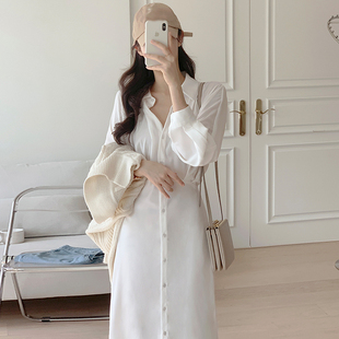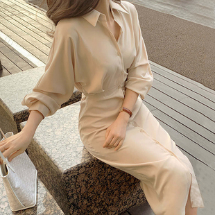 连衣裙女 衬衫 韩国chic秋季 优雅气质翻领单排扣系带收腰显瘦中长款