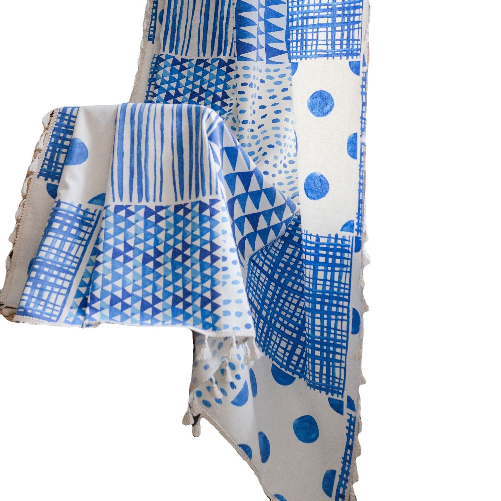 美式 蓝色几何拼接印花窗帘穿杆厨房帘飘窗 免打孔窗帘波西米亚风格