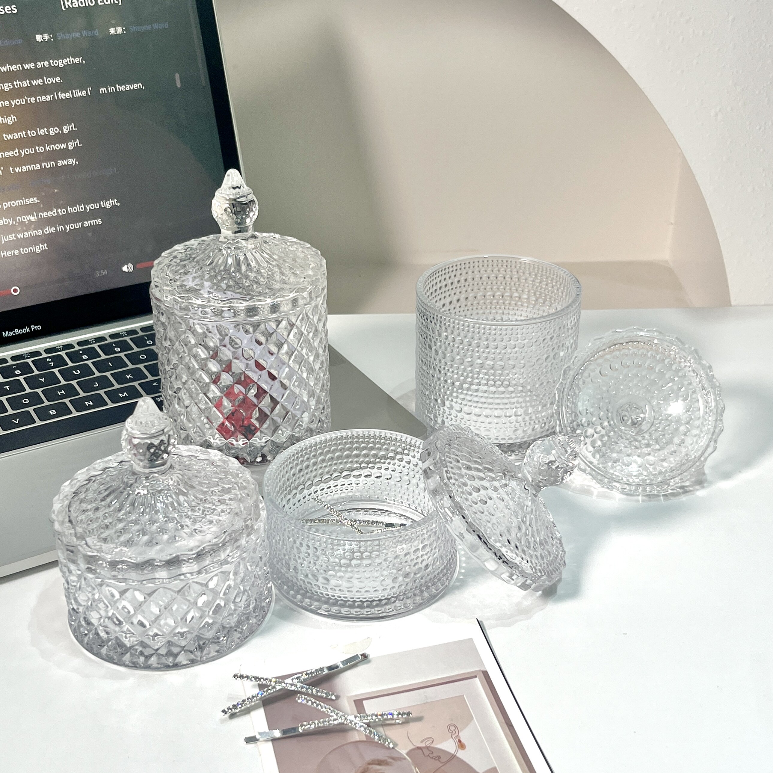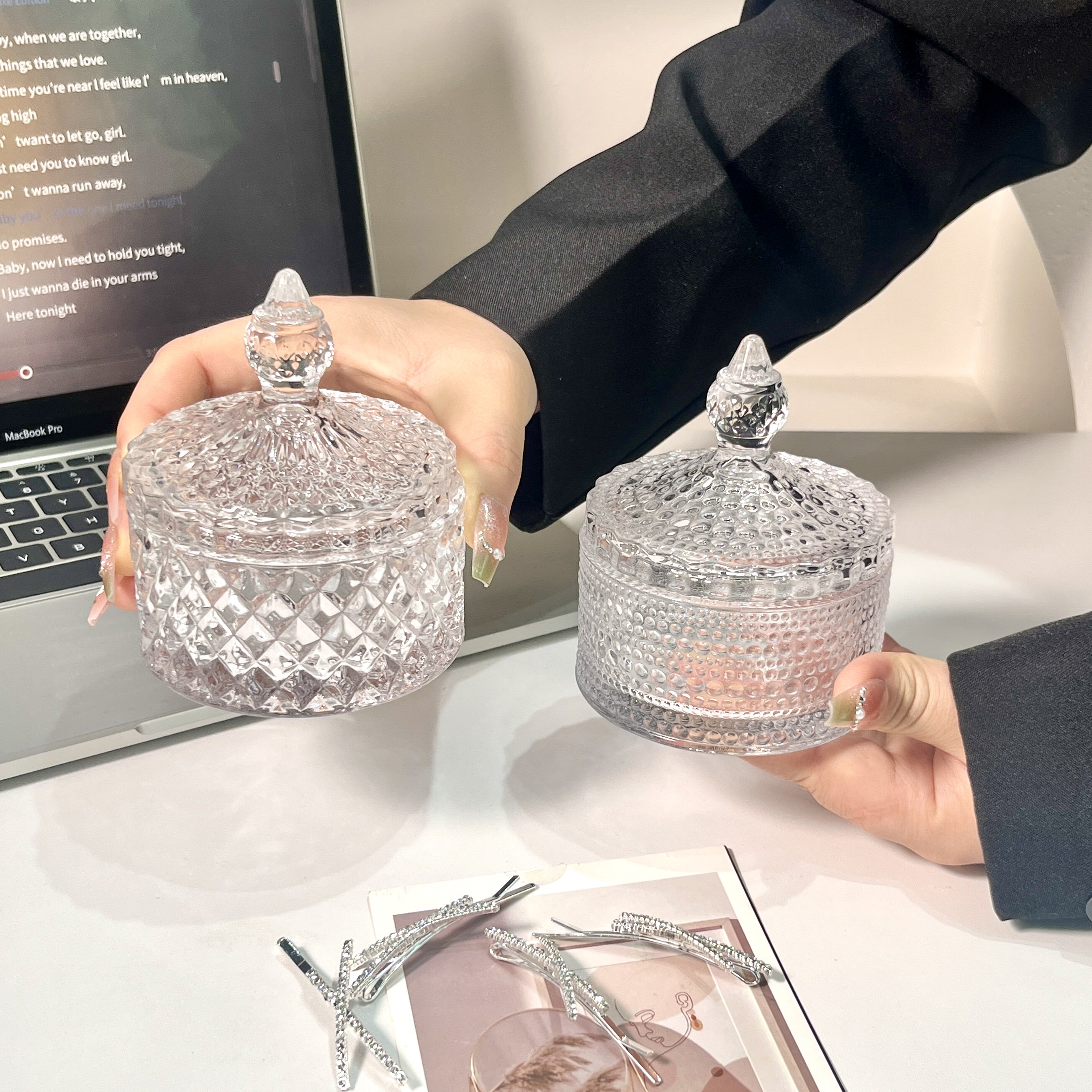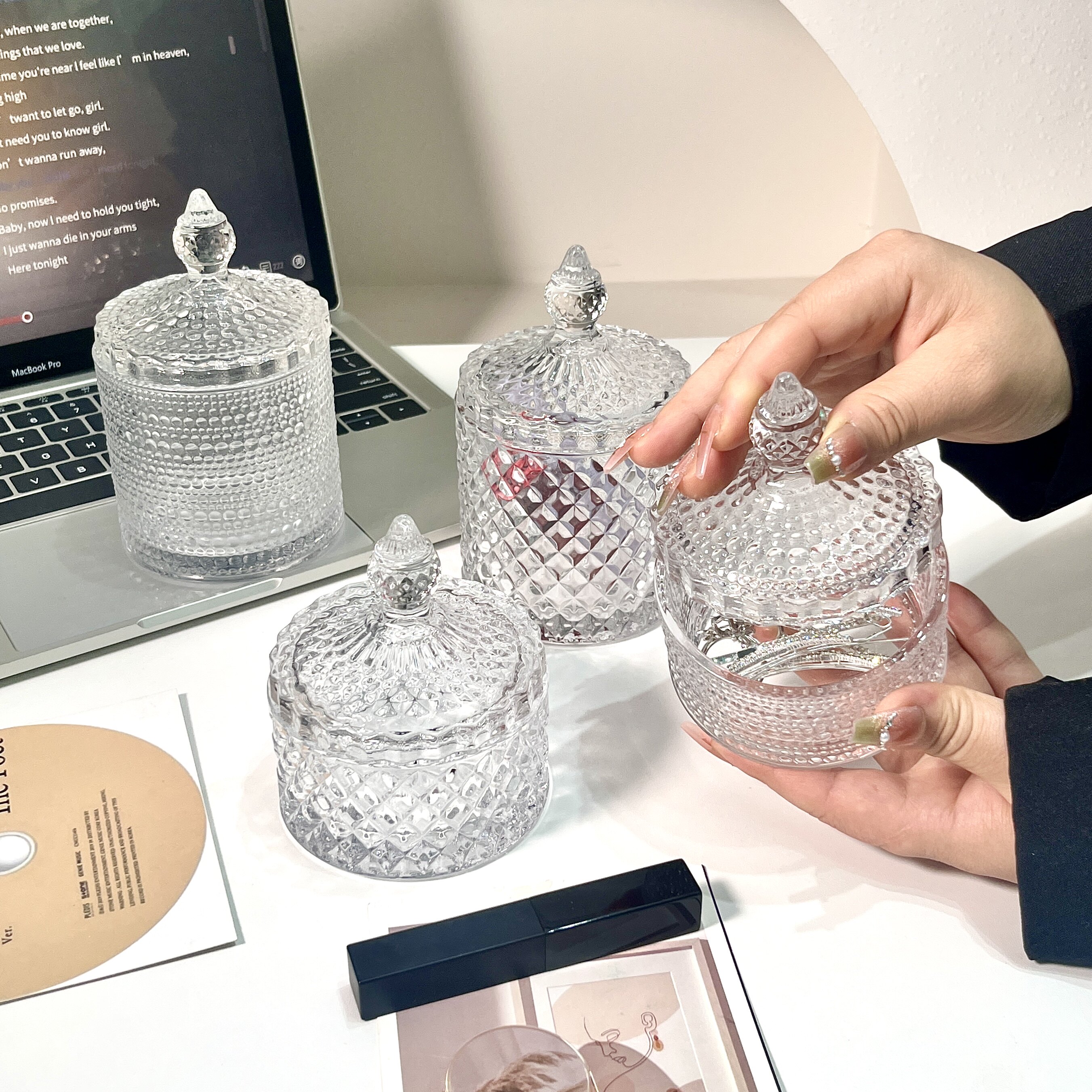 ins轻奢玻璃笔筒口红化妆刷首饰盒带盖棉签收纳盒家用精致糖果罐