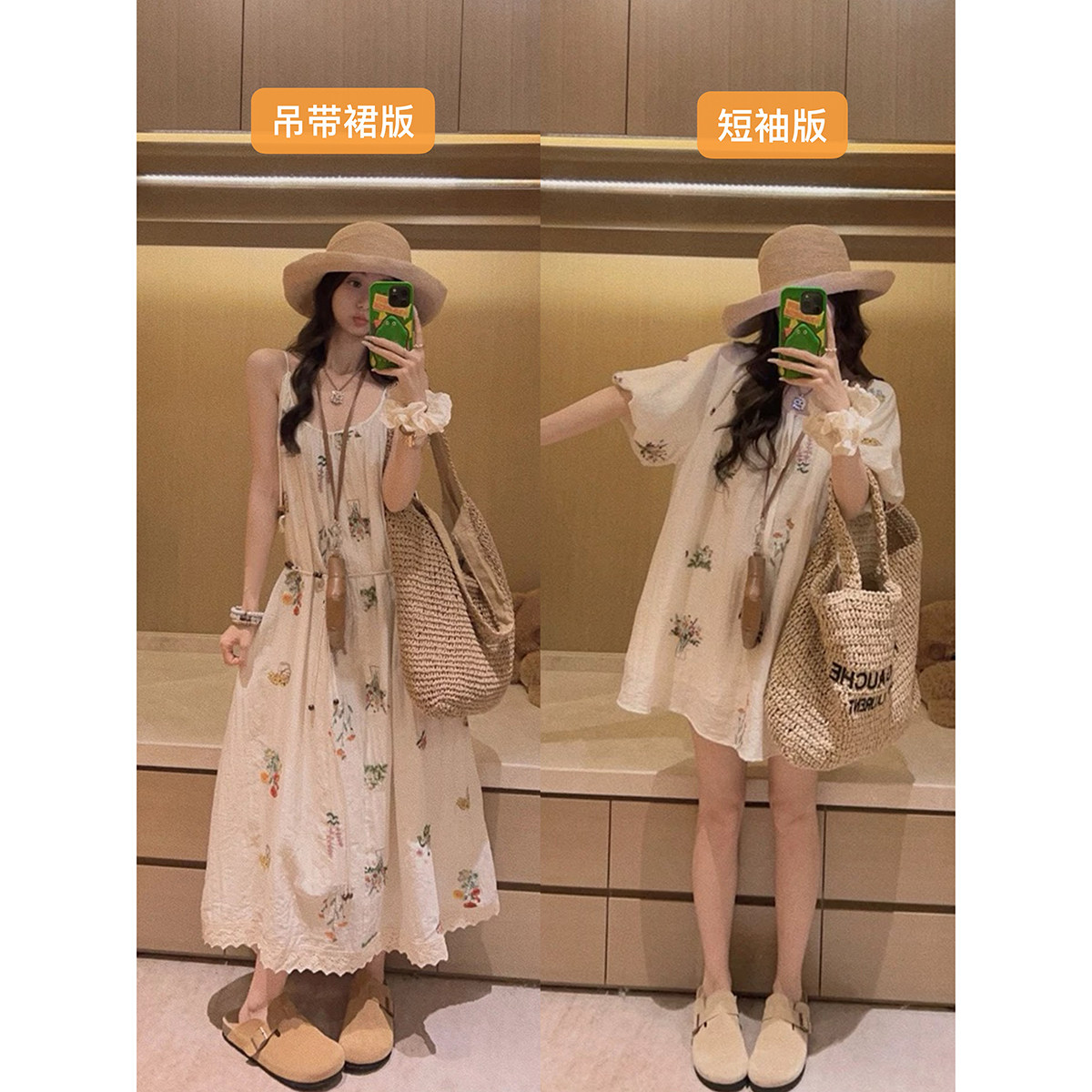 Yukiss 天丝亚麻刺绣连衣裙女夏韩系宽松遮肉裙子 米色复古灯笼袖