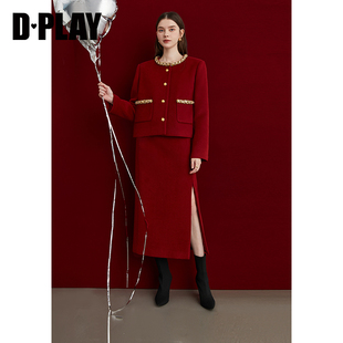 红色小香风套装 DPLAY 新款 2025年冬季 女羊毛新年外套裙子 黑标