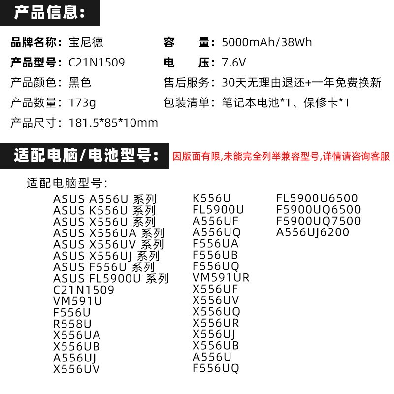 X556UV F556U R558U笔记本电池 华硕FL5900U VM591U C21N1509