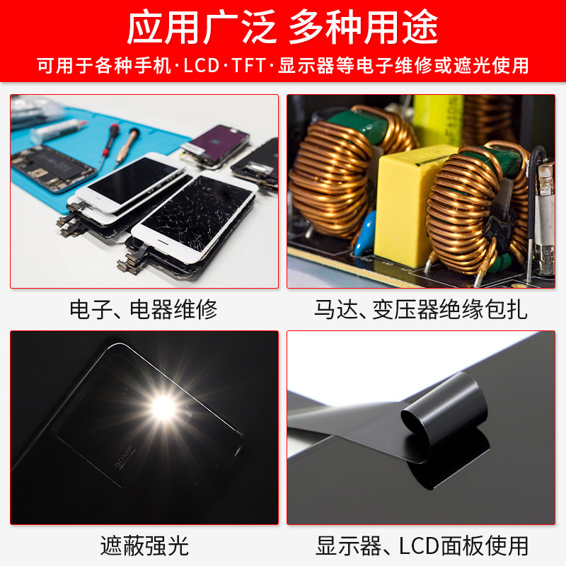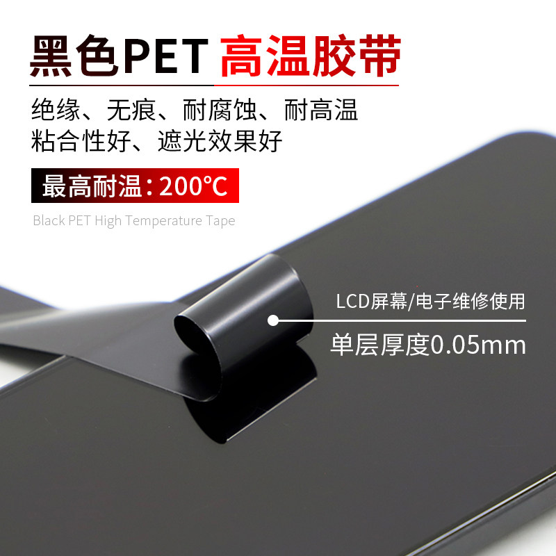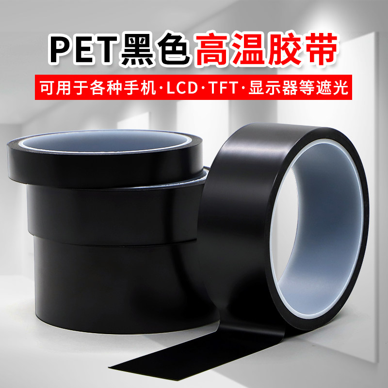 PET黑色高温胶带 PCB线路板电镀汽车烤漆无痕遮蔽胶带黑色喷涂耐高温胶布酸碱喷塑防烤保护膜胶带耐高温200度