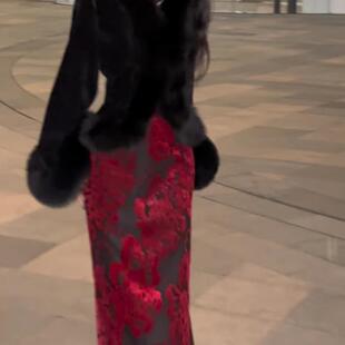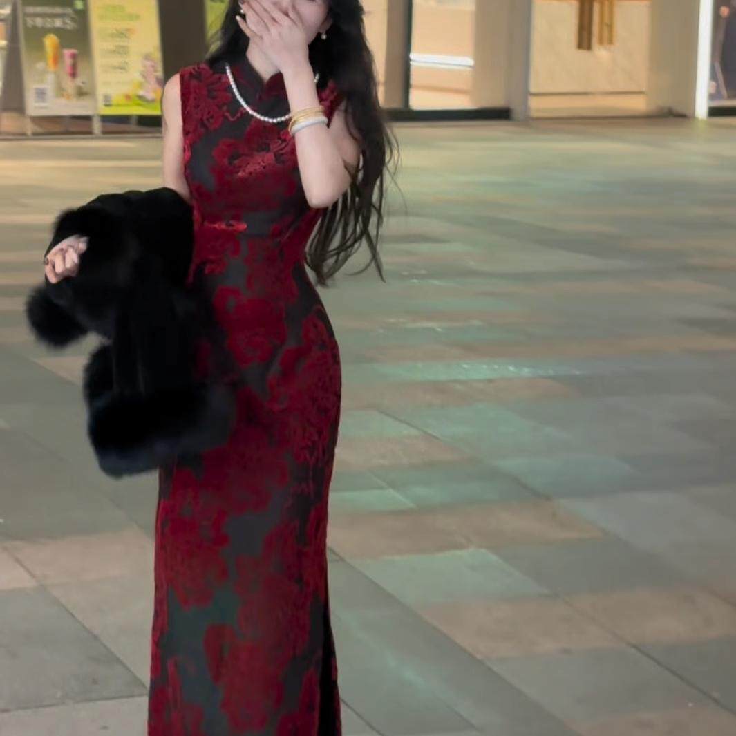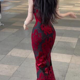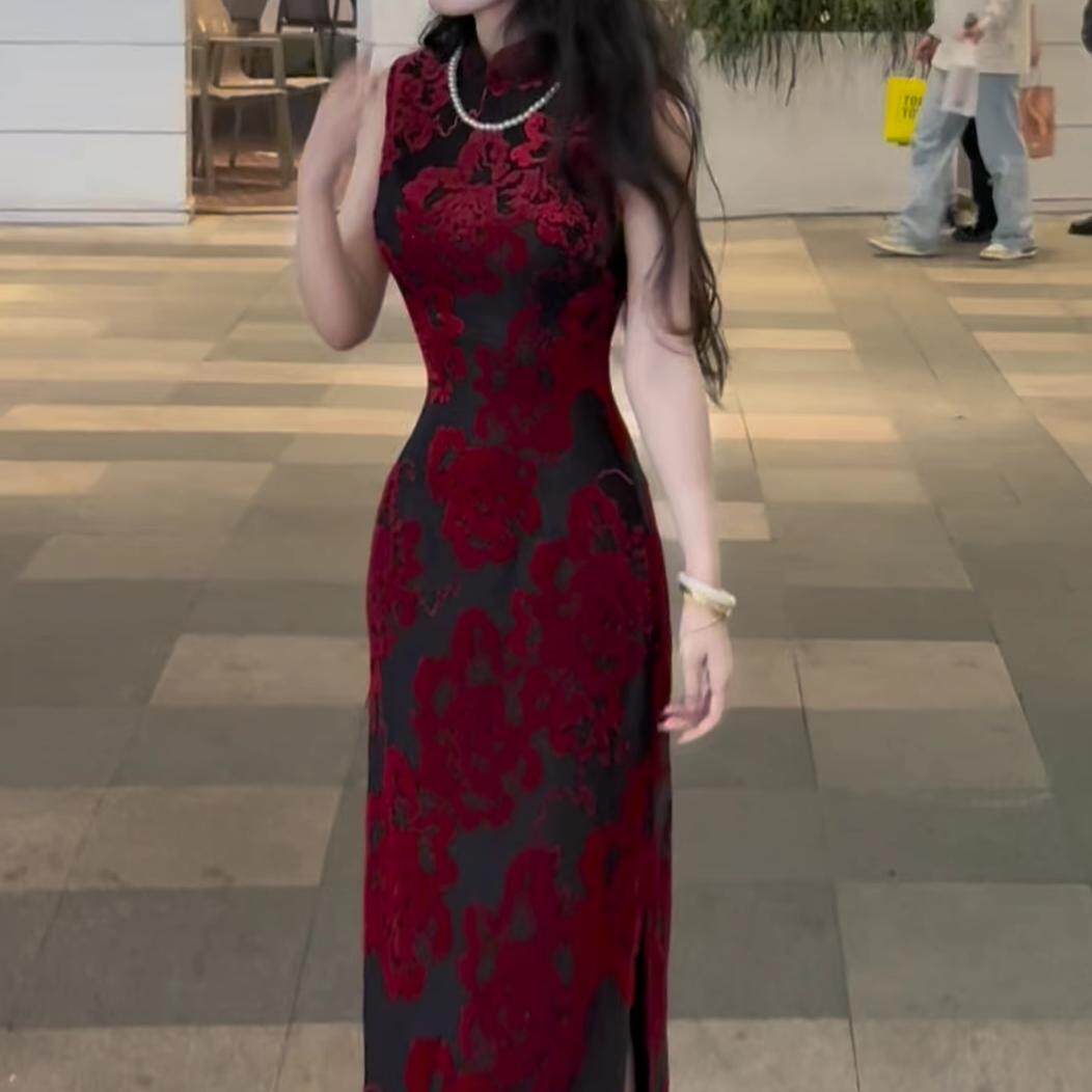 春夏新款 港工旗袍收腰婆娑红 改良旗袍女高级妖艳立体花朵提花无袖