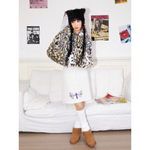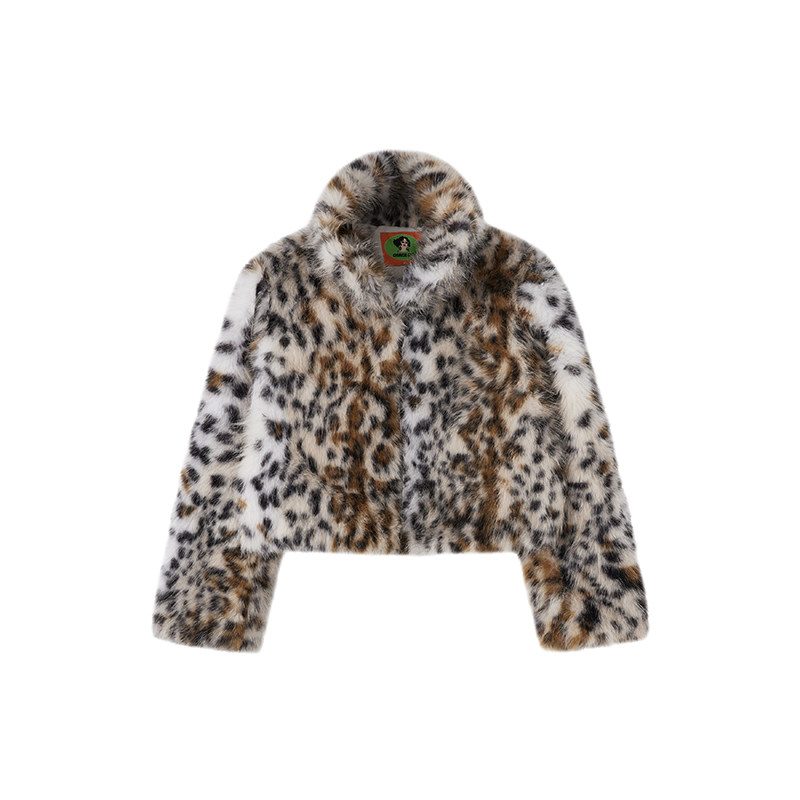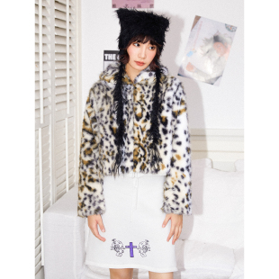 化学少女「抱抱豹豹」翻领斑点豹纹皮草毛绒短外套女 线下同款