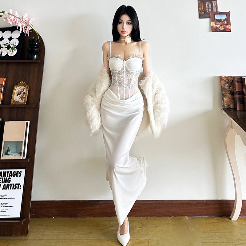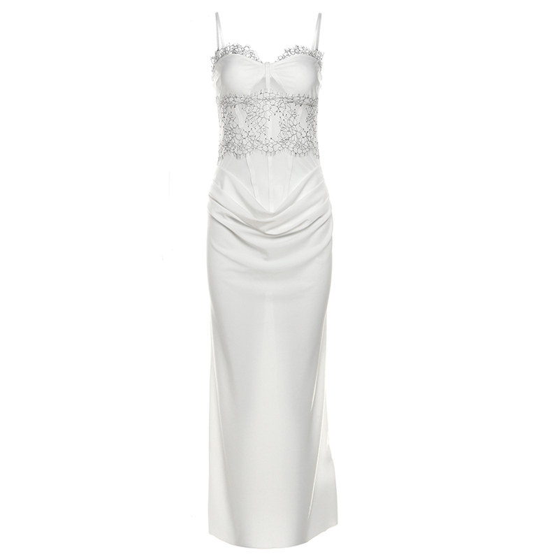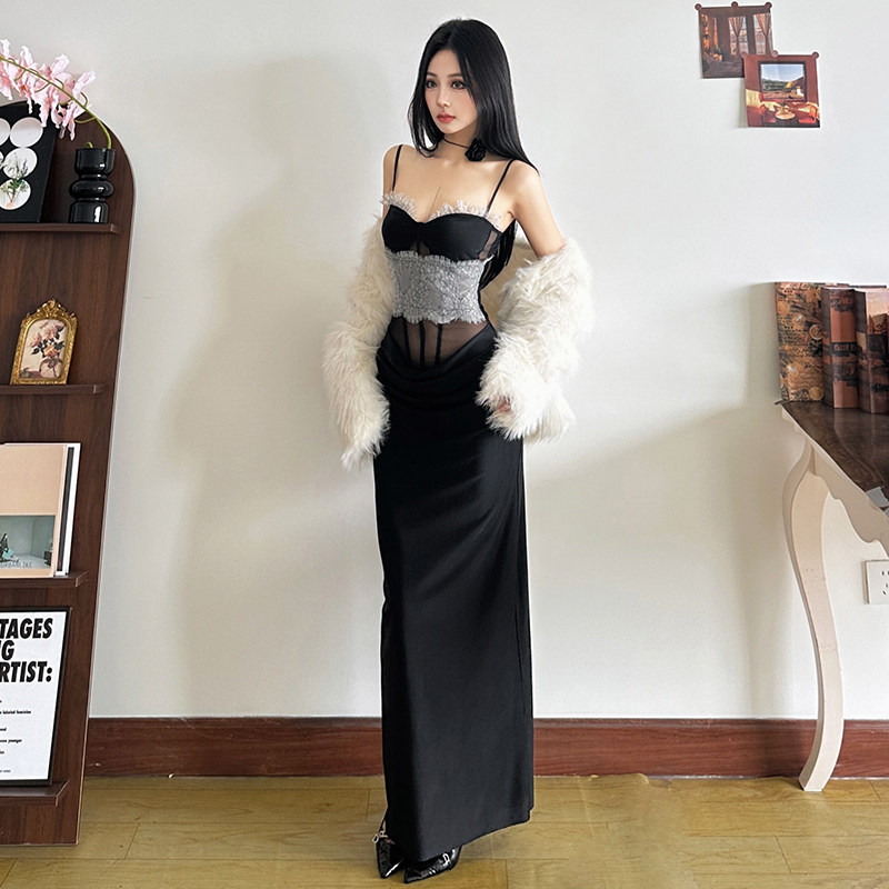 收腰包臀长裙 修身 怪诞女孩 重工设计感撞色蕾丝鱼骨吊带连衣裙女