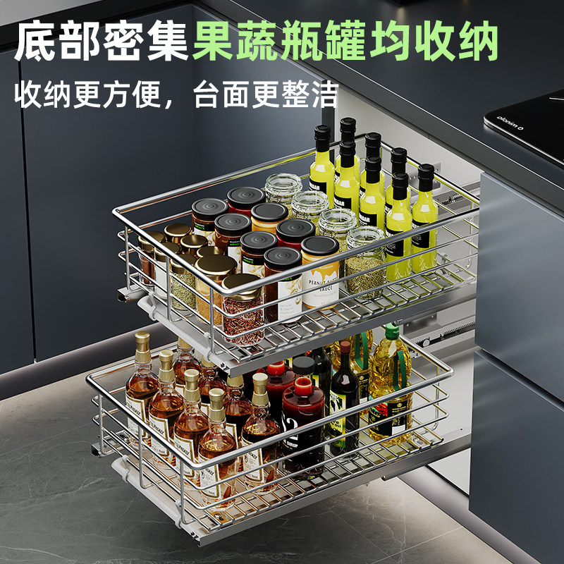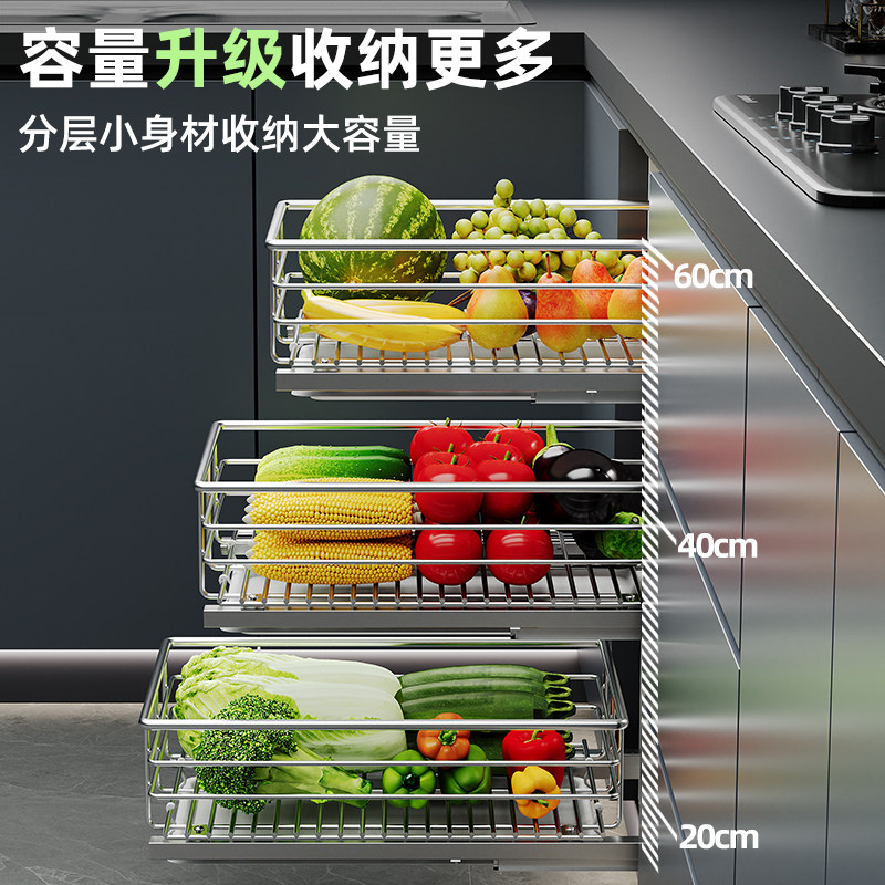 厨房果蔬篮抽屉式 304不锈钢橱柜拉篮水果蔬菜杂物置物架收纳阻尼
