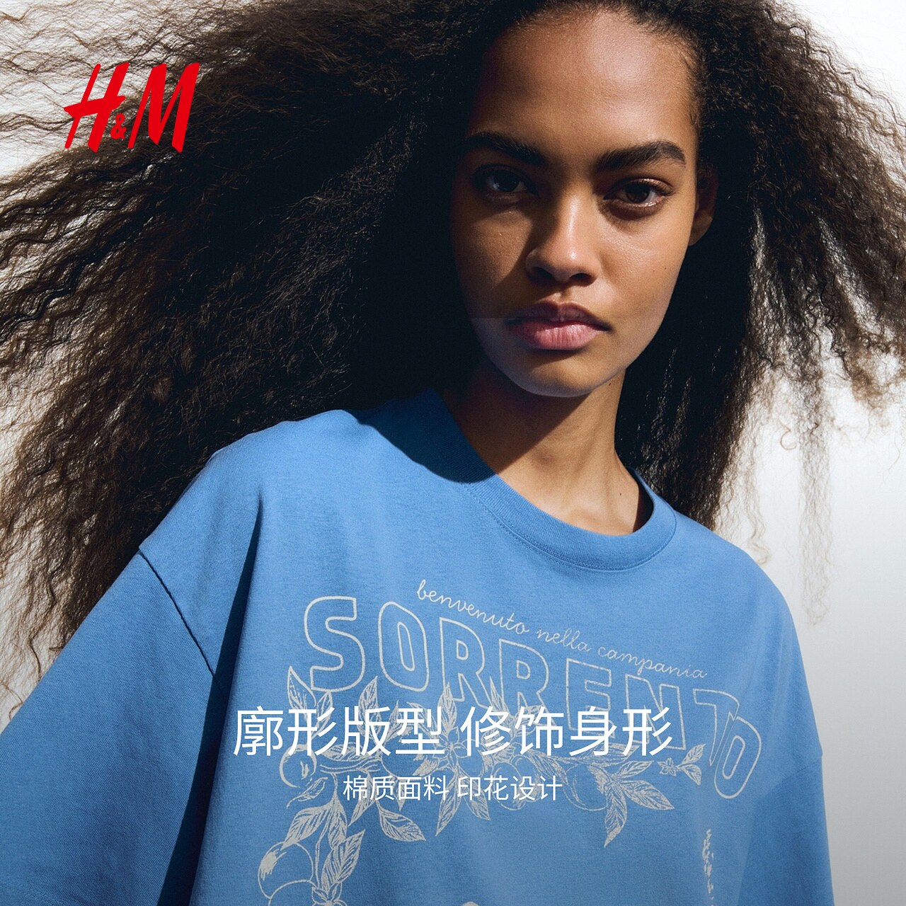 宽松棉质落肩短袖 印花圆领美式 上衣1296379 T恤春季 HM女装