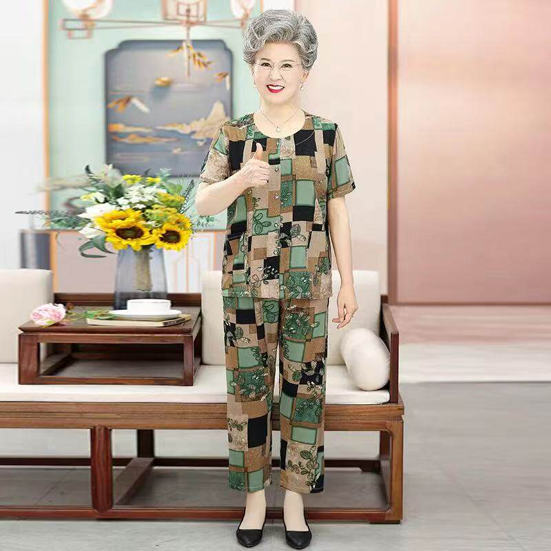 睡衣女纯棉绸老人家居服奶奶套装 九分裤 洋气质 短袖 老太太夏天薄款