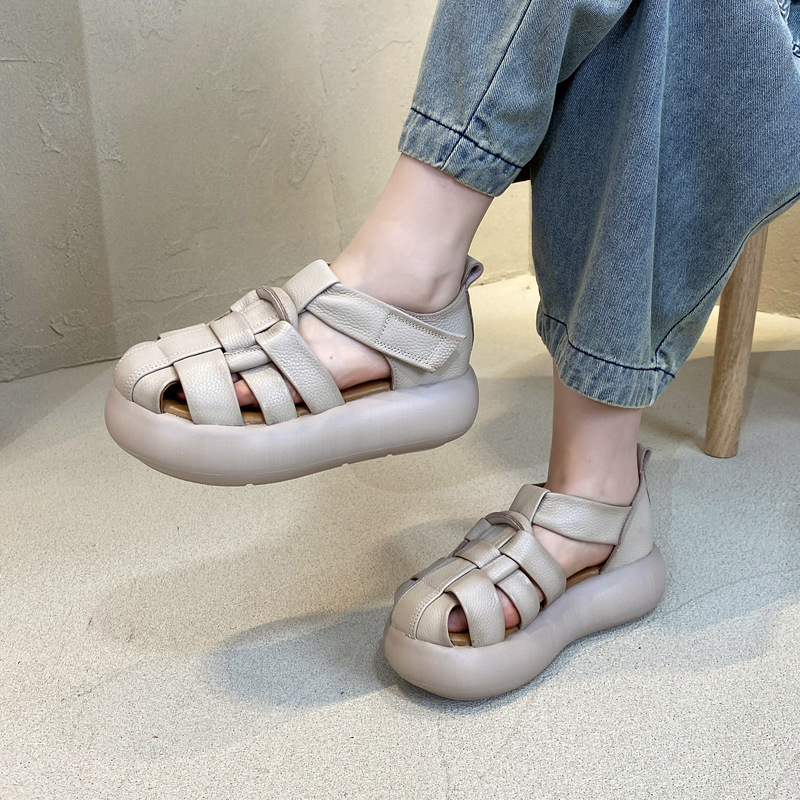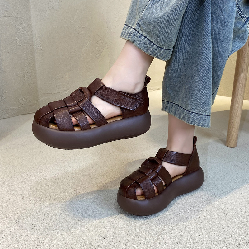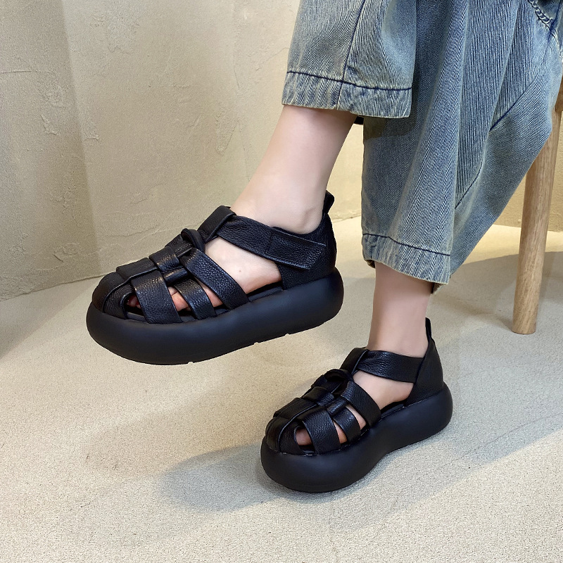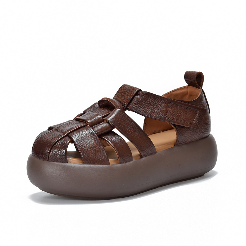 手工真皮凉鞋 2025夏季 女厚底包头猪笼鞋 头层牛皮编织罗马凉鞋 新款