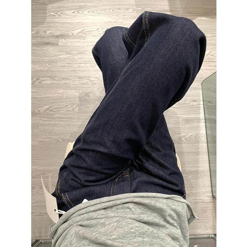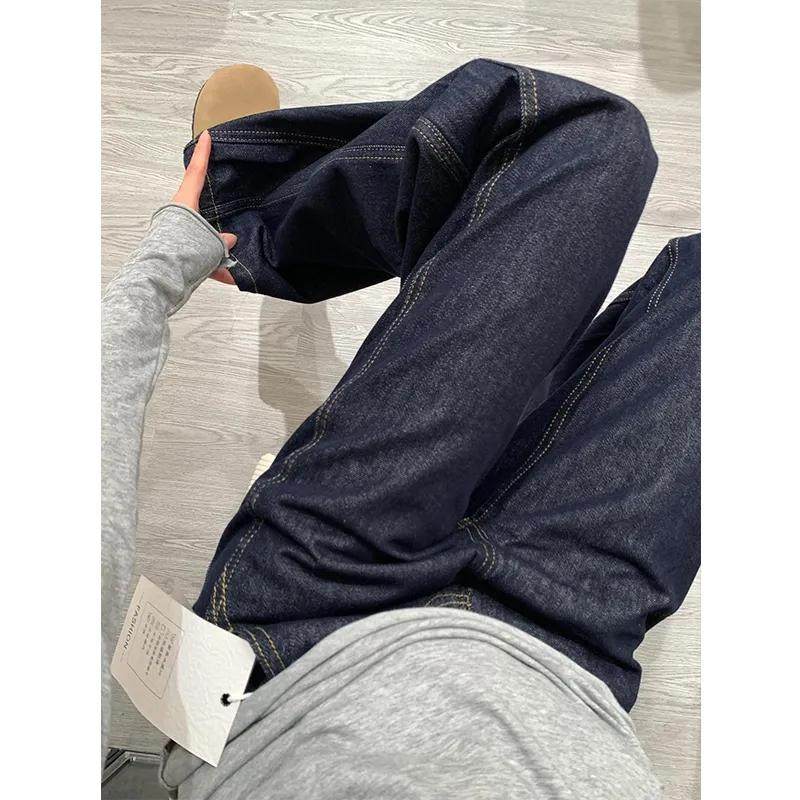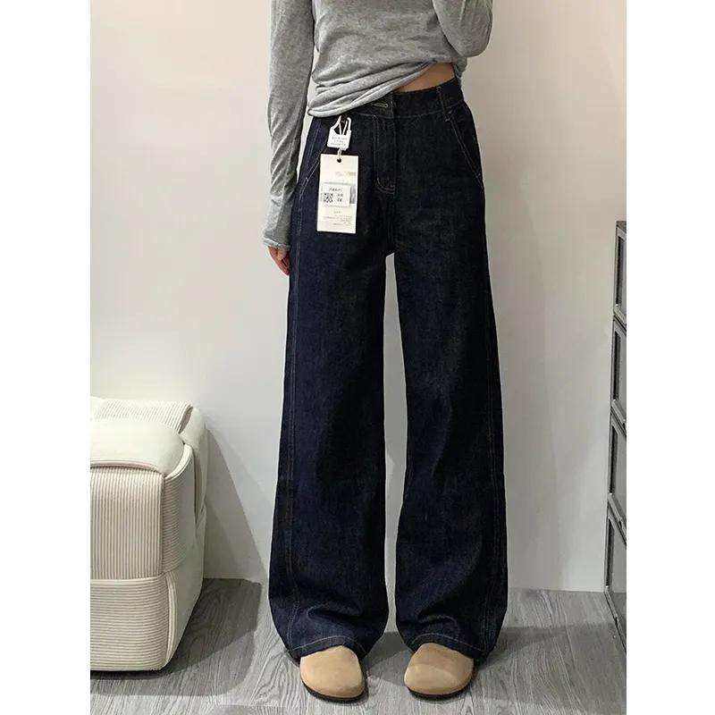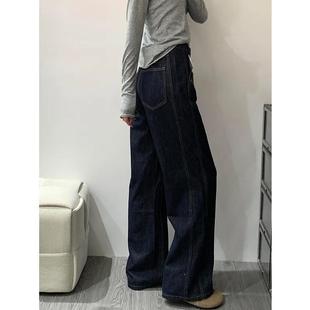 韩系小个子水洗深蓝色直筒牛仔裤 女高腰遮跨宽松显瘦百搭阔腿长裤