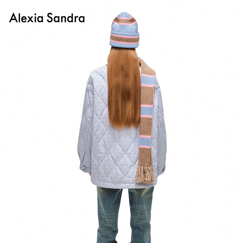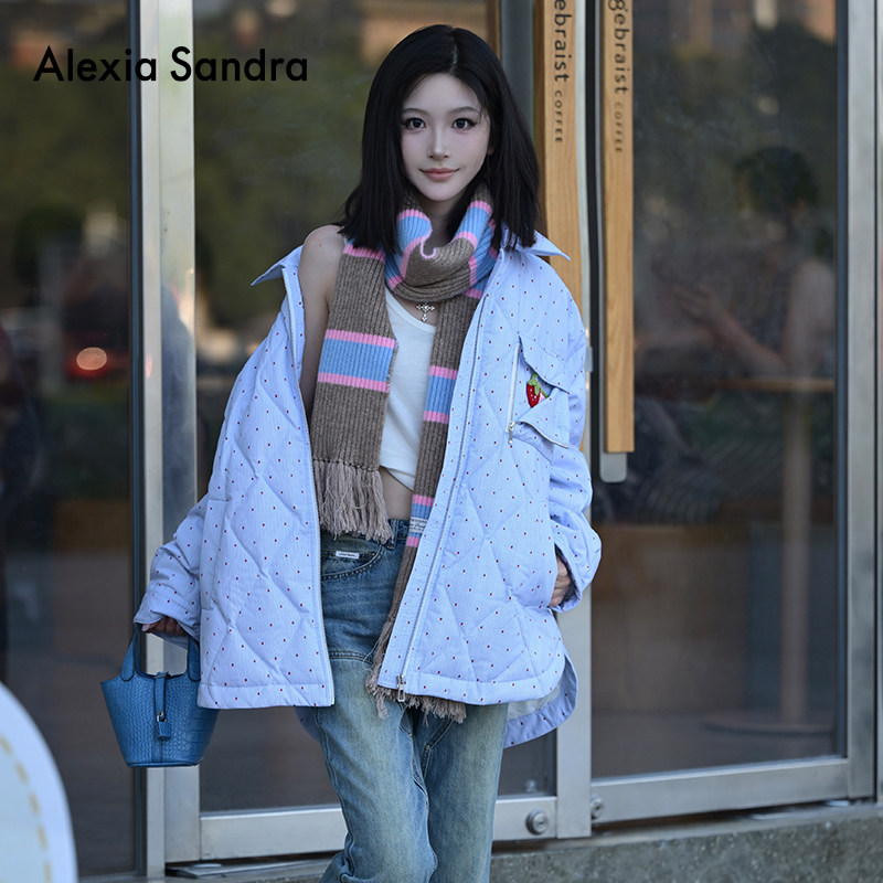 浅蓝方格蓬松轻羽绒服 潮 灰针织围巾韩系温柔冬日松弛感穿搭套装