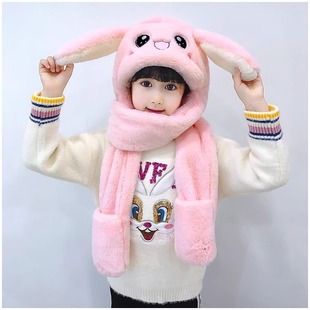 儿童帽子围巾一体兔耳朵会动手套秋冬季 男女童宝宝加厚可爱三件套
