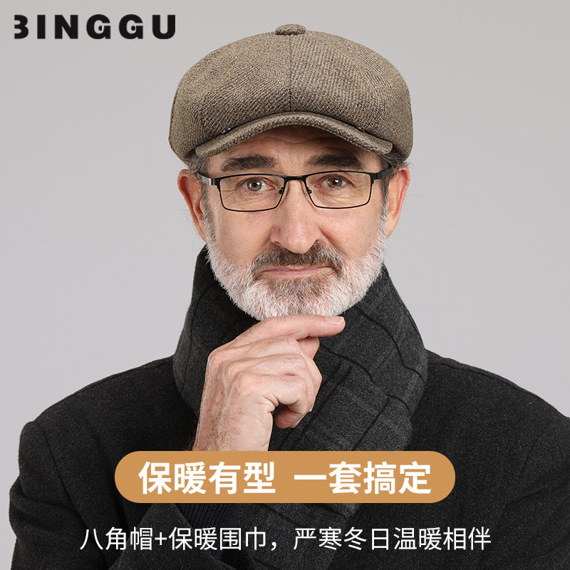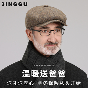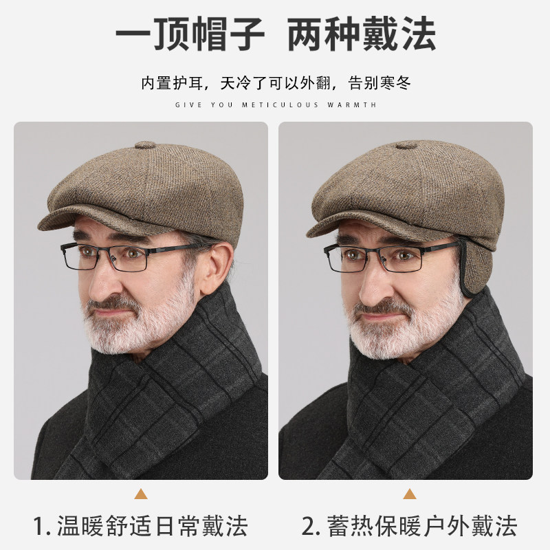 中老年人帽子男秋冬季 八角贝雷帽老人爸爸爷爷护耳保暖前进鸭舌帽