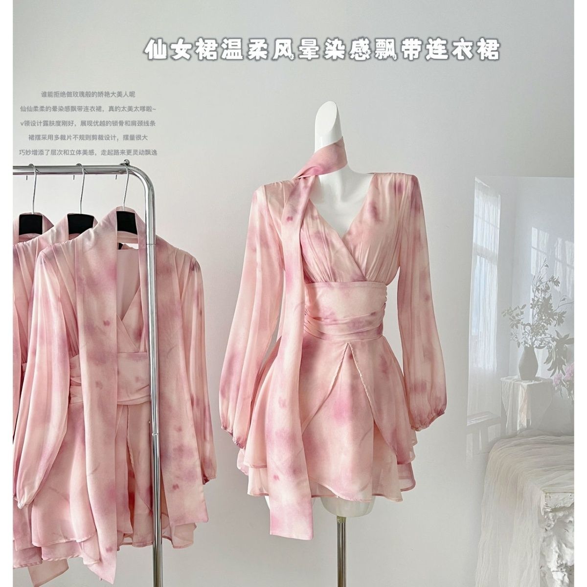 高品质娇艳雪纺大美人夏季 仙女收腰温柔晕染飘带连衣裙碎花裙 新款