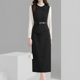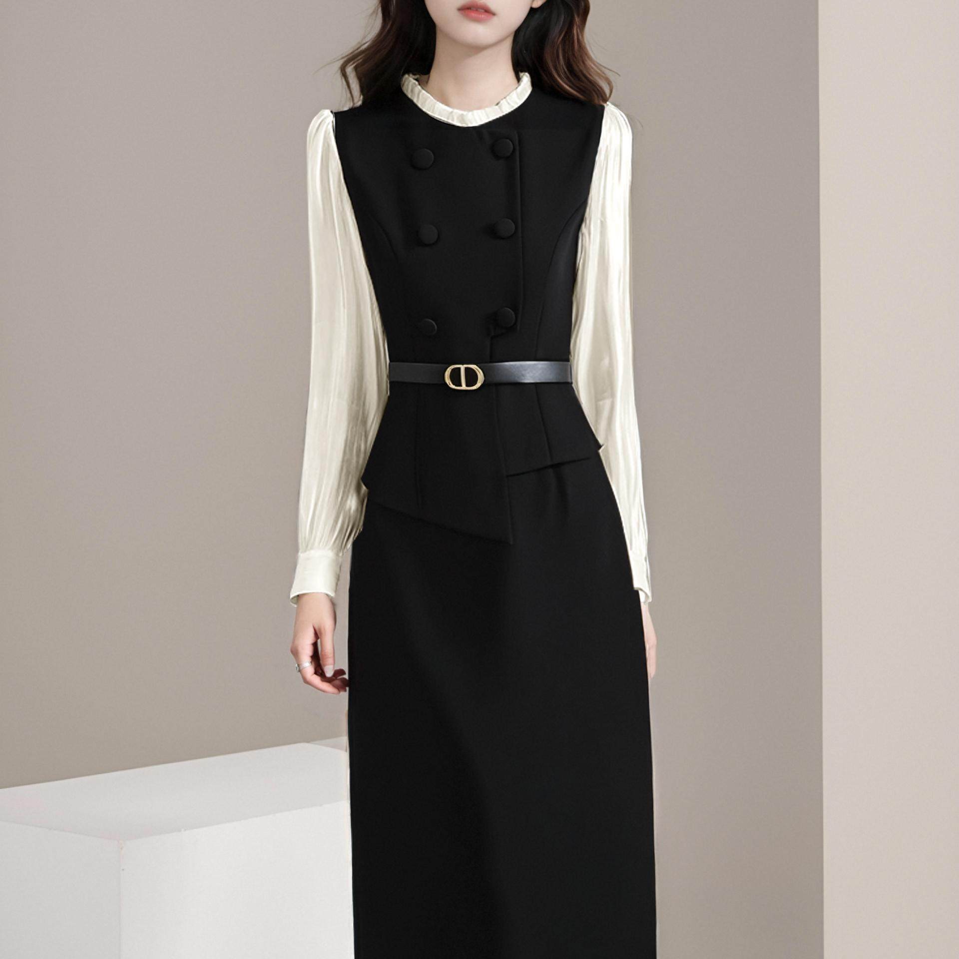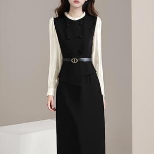 包臀女装 长袖 系带修身 新款 连衣裙2116 拼接气质通勤假两件2026春季