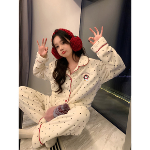 亲嘴猫三层加厚保暖珊瑚绒情侣夹棉可外穿睡衣女冬连帽套装 家居服