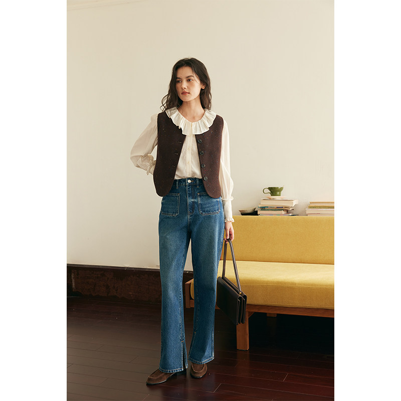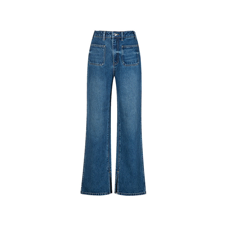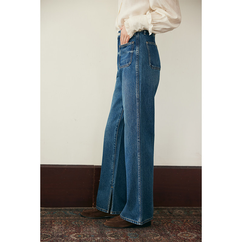 深蓝色裤 宽松高腰阔腿微喇裤 子 女春季 HeyDress复古双口袋牛仔裤