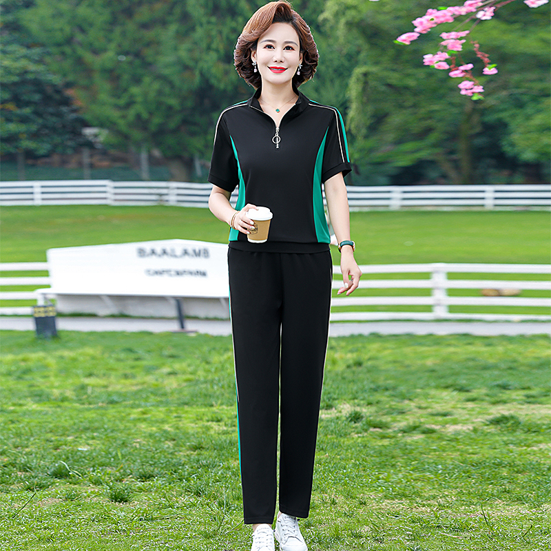 T恤运动服套装 中老年女短袖 洋气休闲两件套翻领新款 中年妈妈夏装