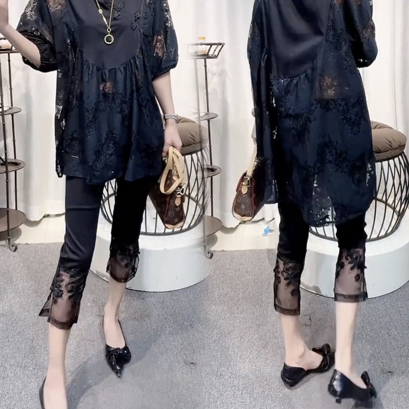 女松紧腰弹力显瘦国风盘扣直筒打底裤 欧货拼接蕾丝纸皮裤 新款 夏季