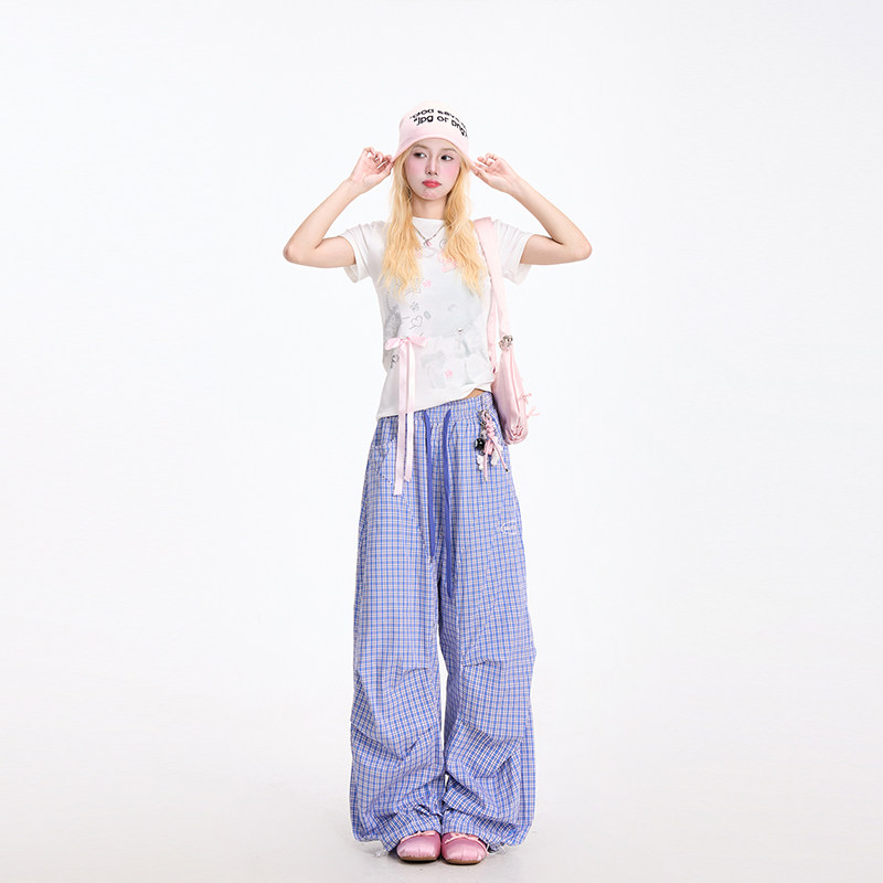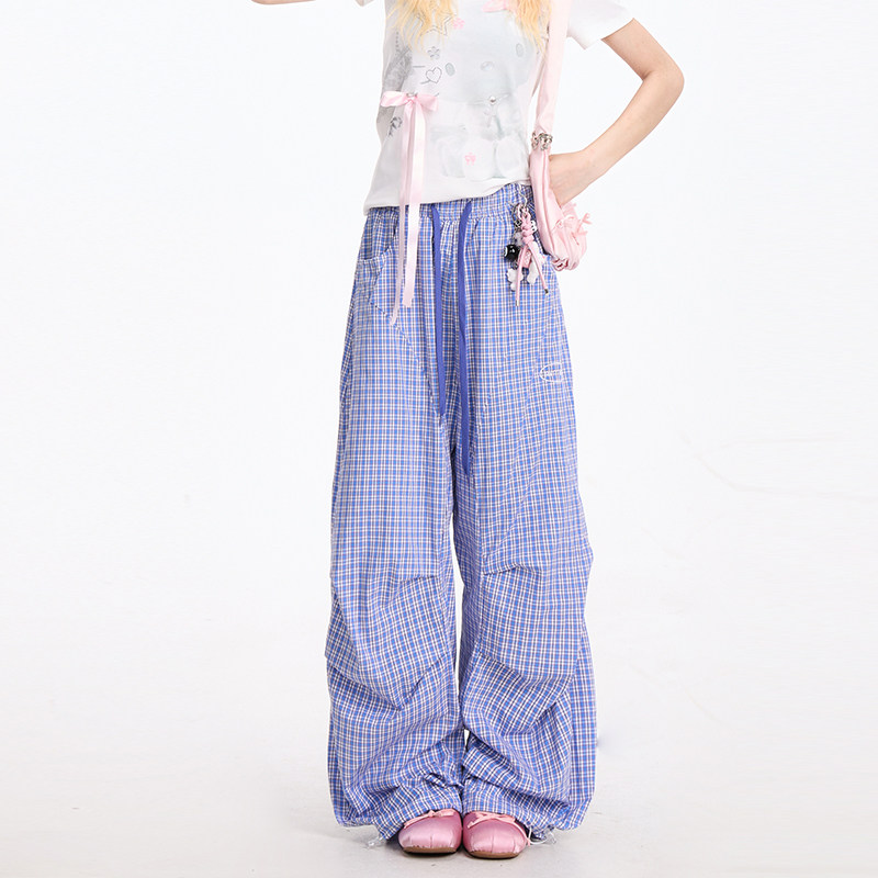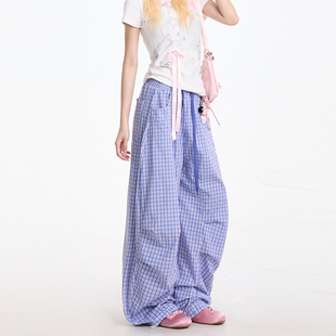 慵懒风垂感小众裤 NERESUM复古蓝色格纹工装 褶皱直筒裤 女美式 子 裤
